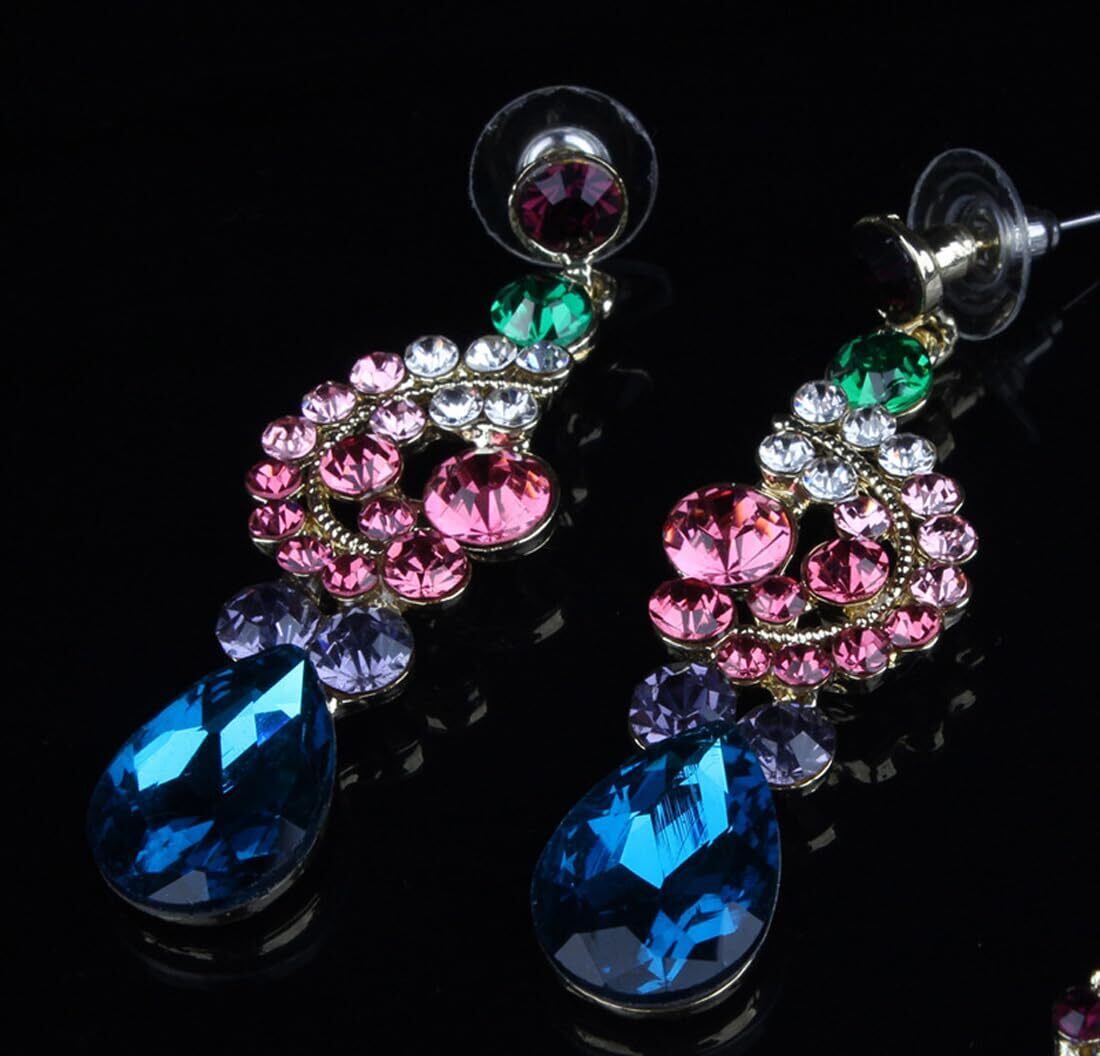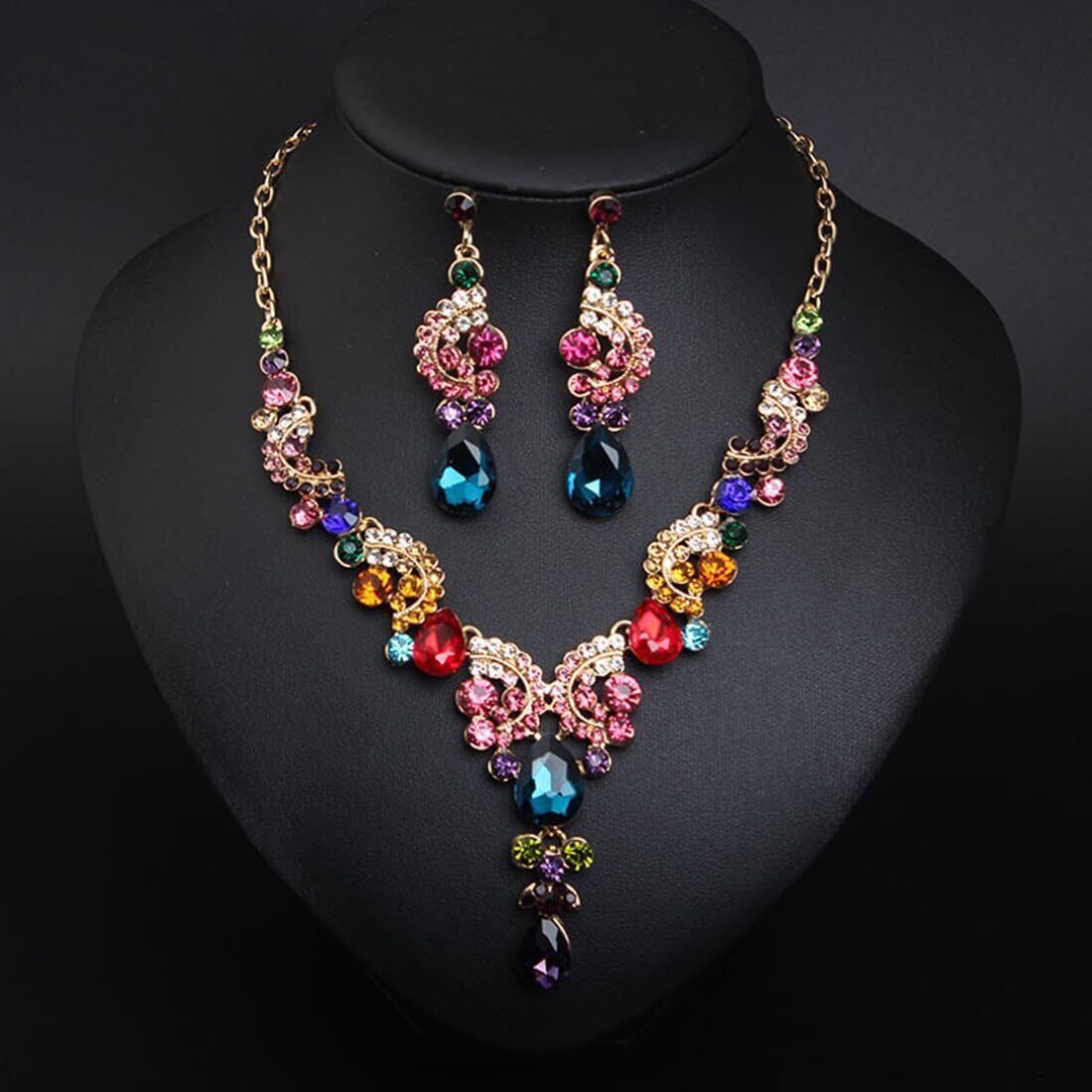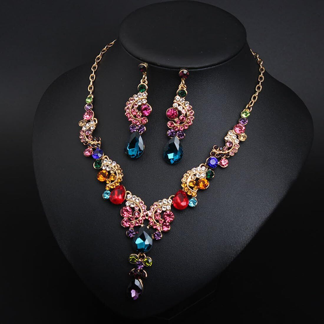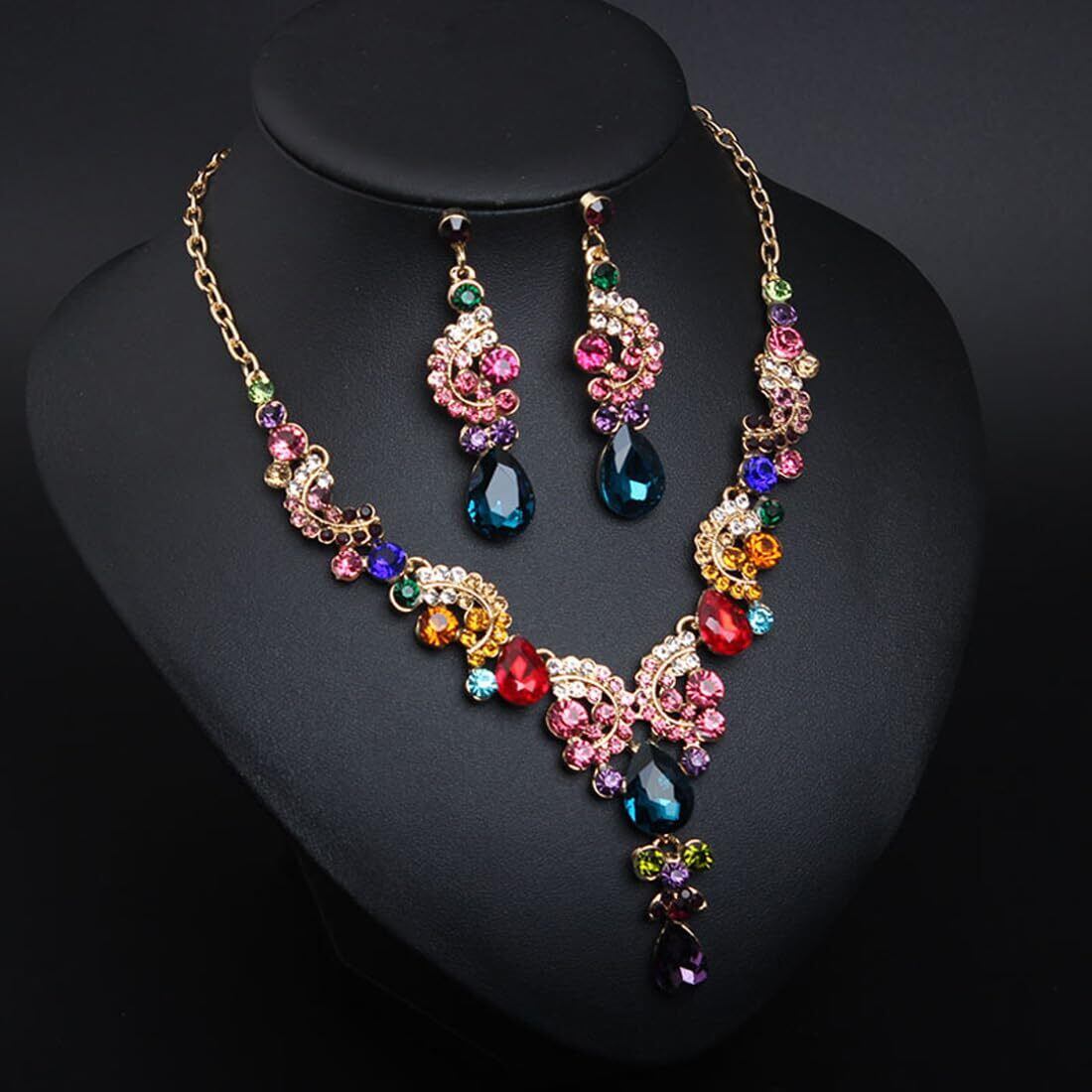 大粒クリスタルガラスとラインストーンをふんだんにあしらったゴージャスなファッションジュエリーです。ネックレスとピアスの2点セットにてお届けいたします。眩いばかりに煌く上品な雰囲気はあらゆるパーティ・フォーマルシーンであなたの装いをより一層演出し輝かせます。