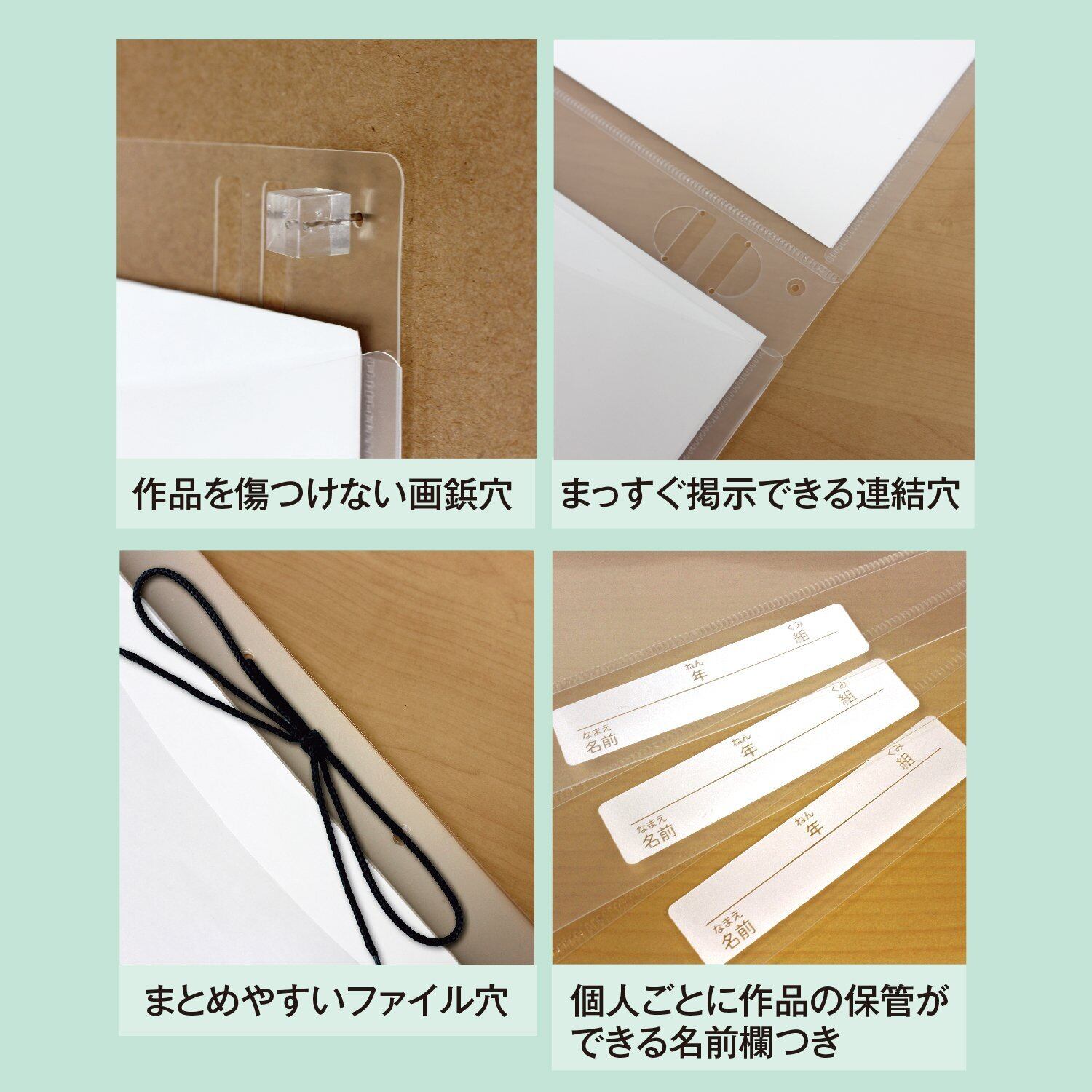 画鋲穴は作品に穴を開けずに掲示ができ、ファイル穴は紐で綴じれるのでまとめて保管する際にも便利