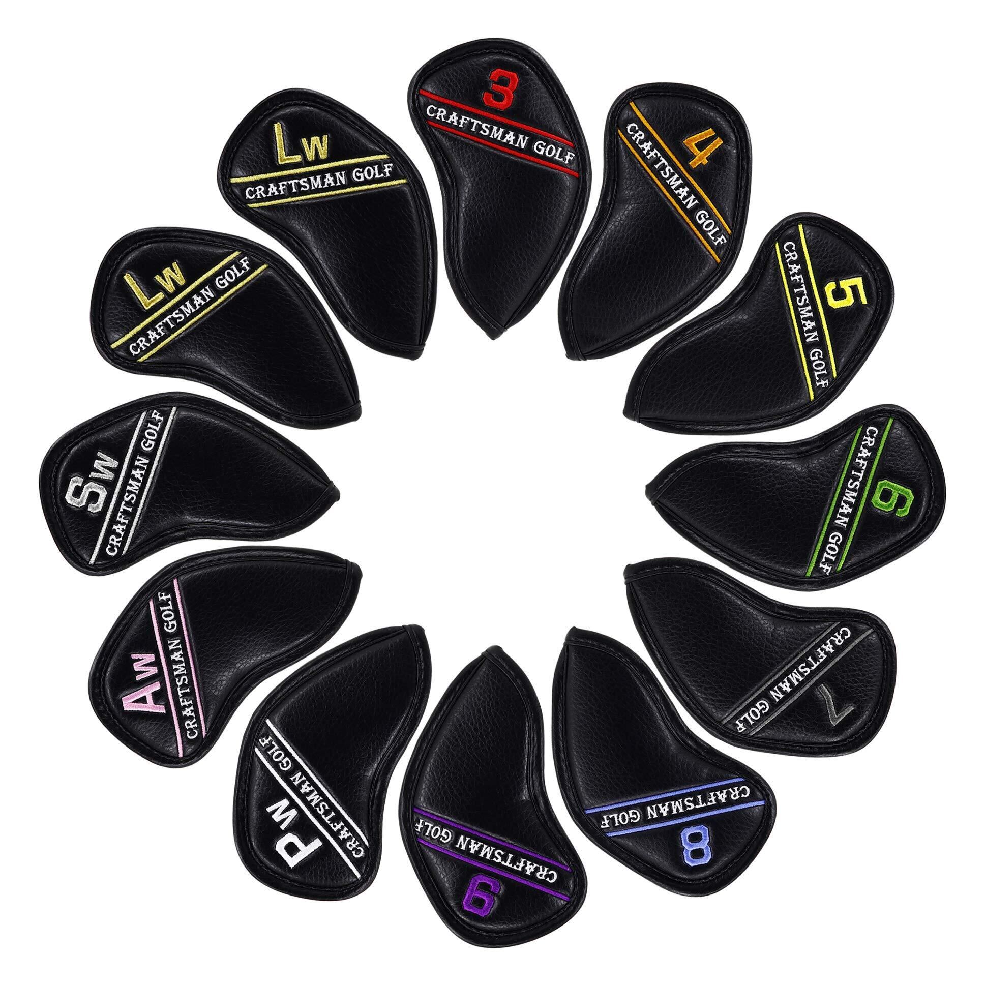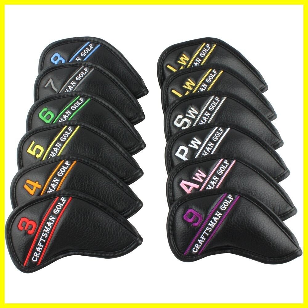 CRAFTSMAN(クラフトマン) ゴルフアイアンカバー ウェッジカバー ヘッドカバー 3~9、Pw、Aw、Sw、Lw、46°、48°、50°、52°、54°、56°、58°、60°、62°、64° 単品/セット販売 カラフル数字 番号刺繍 マジックテープ開閉 合成皮革 ブラック/ホワイト