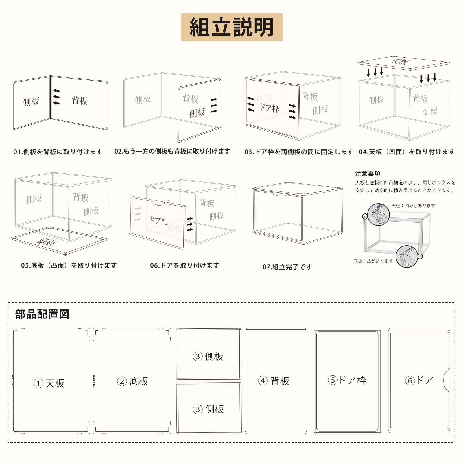 【積重ね安定】天板と底板に凹凸構造を採用し、積み重ねてもズレにくく安定感抜群。傾けても倒れにくいため、安全に複数段で使用可能です。縦にスタッキングすれば空間を有効活用でき、省スペース収納を実現します。