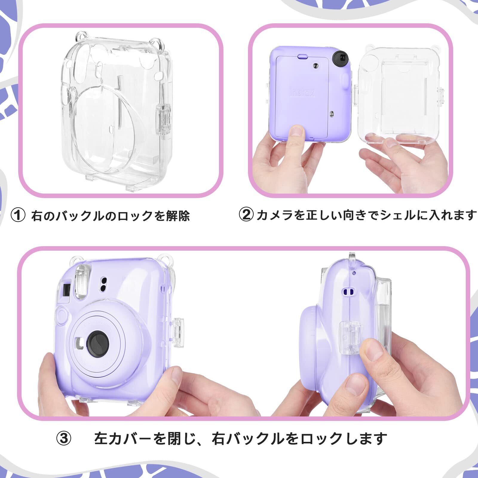 素材 - 防水性と防塵性の素材、滑らかで高い透明度。ハードPCクリスタルシェルは耐久性があり軽量で、mini12インスタントカメラを傷、ほこり、一般的な摩耗や損傷から安全に保護します。