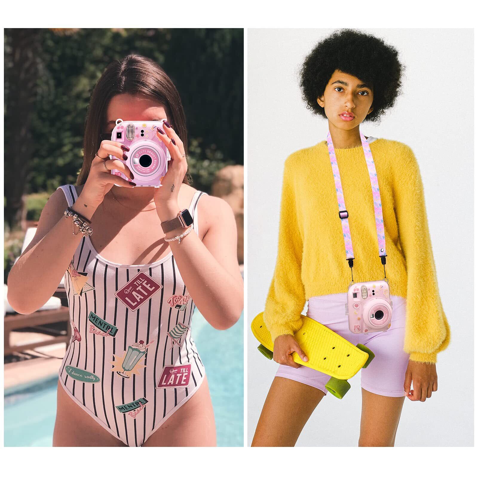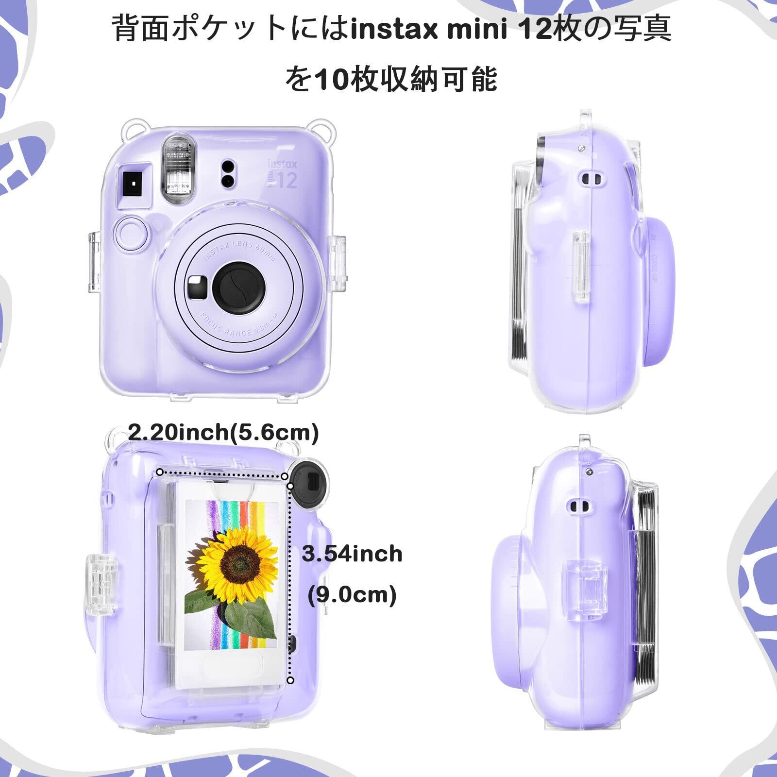 写真の収納便利-クリアケースに写真収納ポケットが付き、10枚のチェキmini12の写真を収納できます。