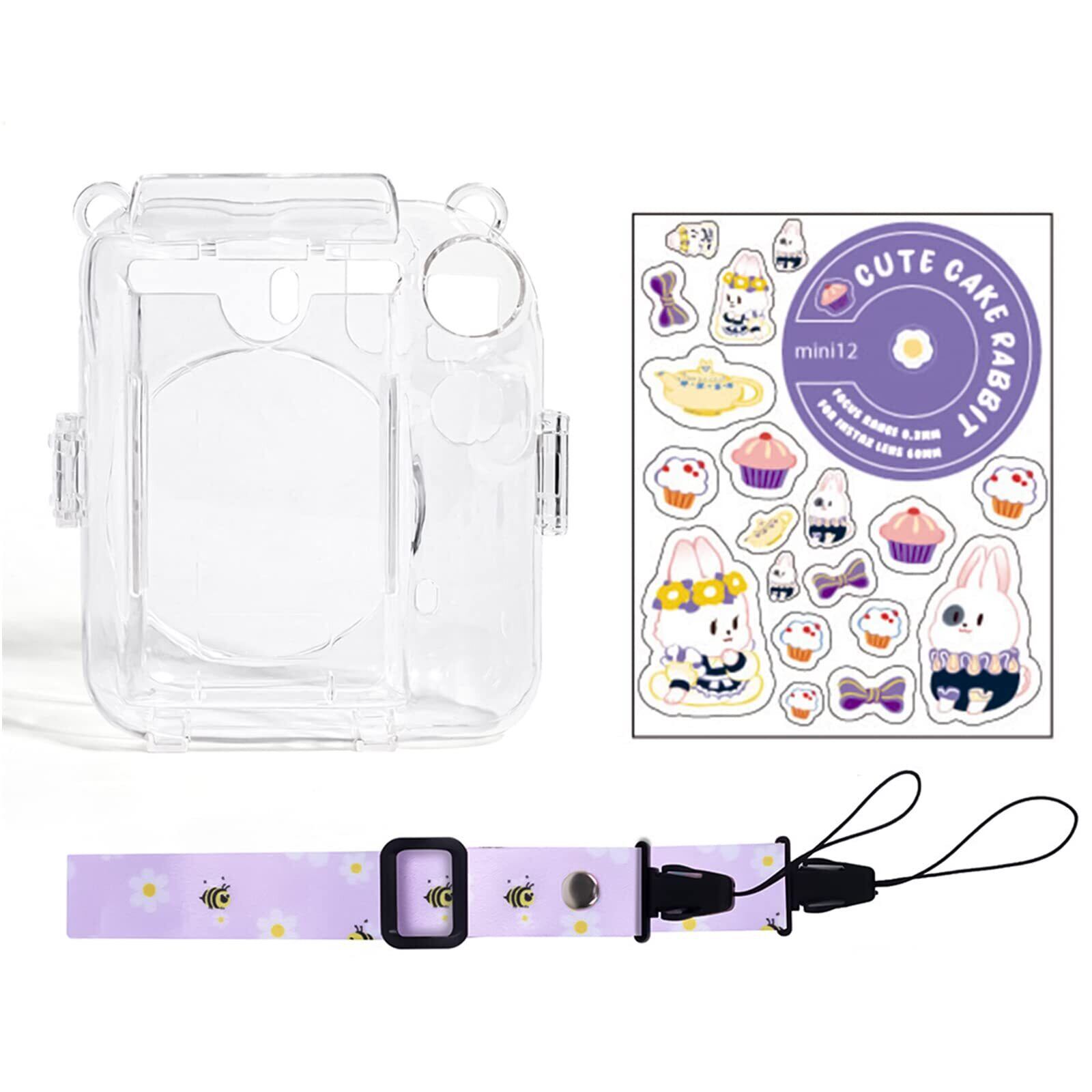 HIYQIN mini12 ケース 富士フイルム Instax Mini 12 カメラ用保護クリアケース クリスタルハードシェルカバー ショルダーストラップ付き カメラステッカー
