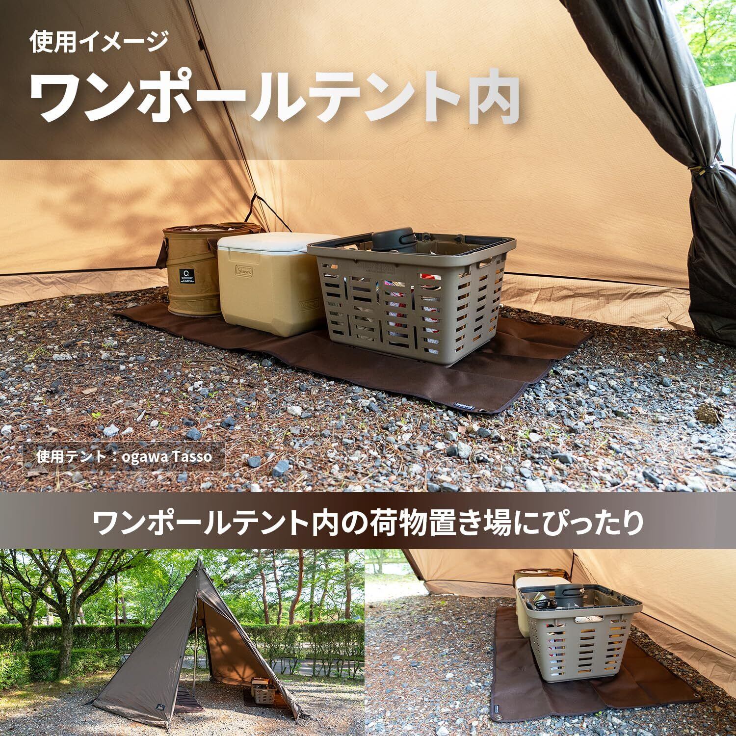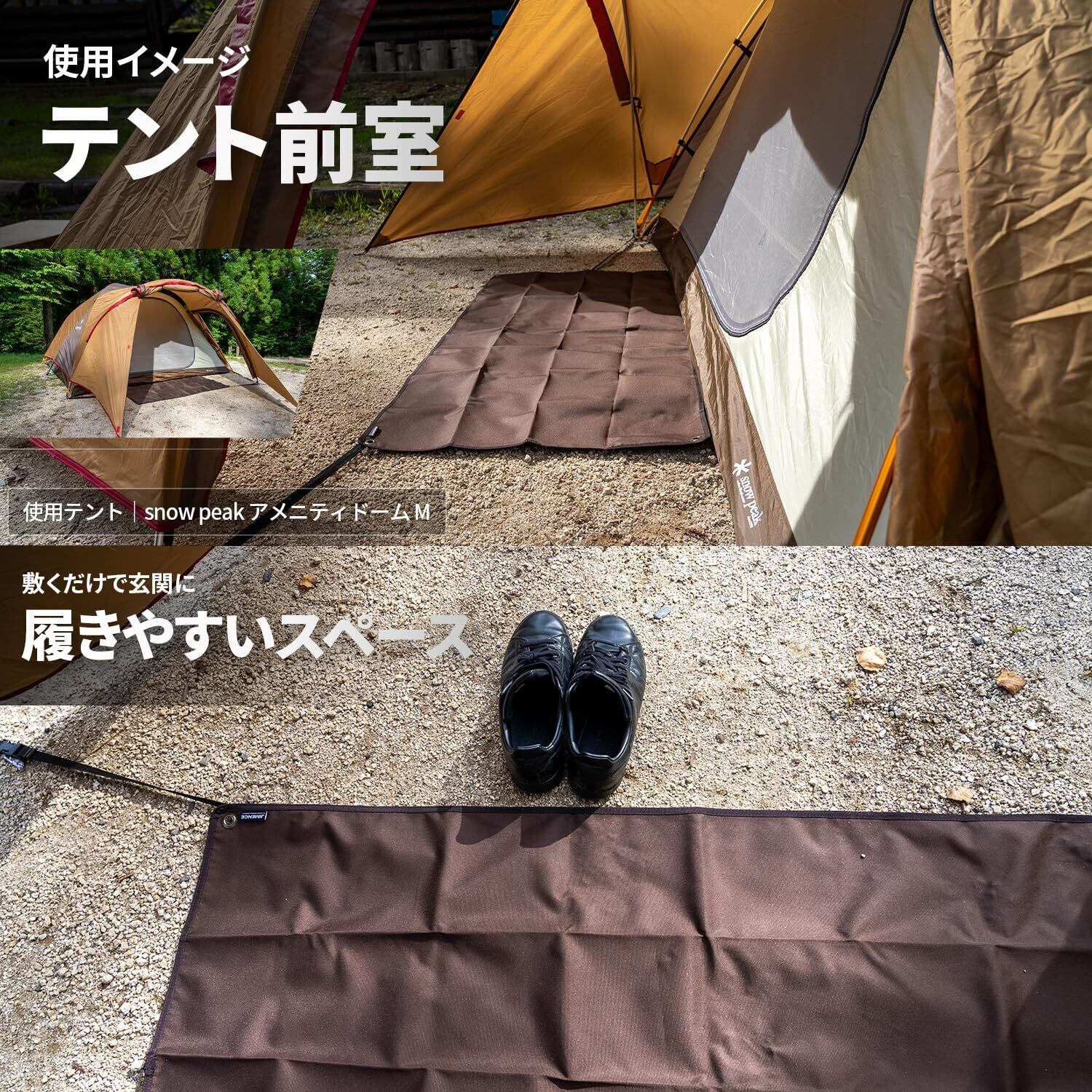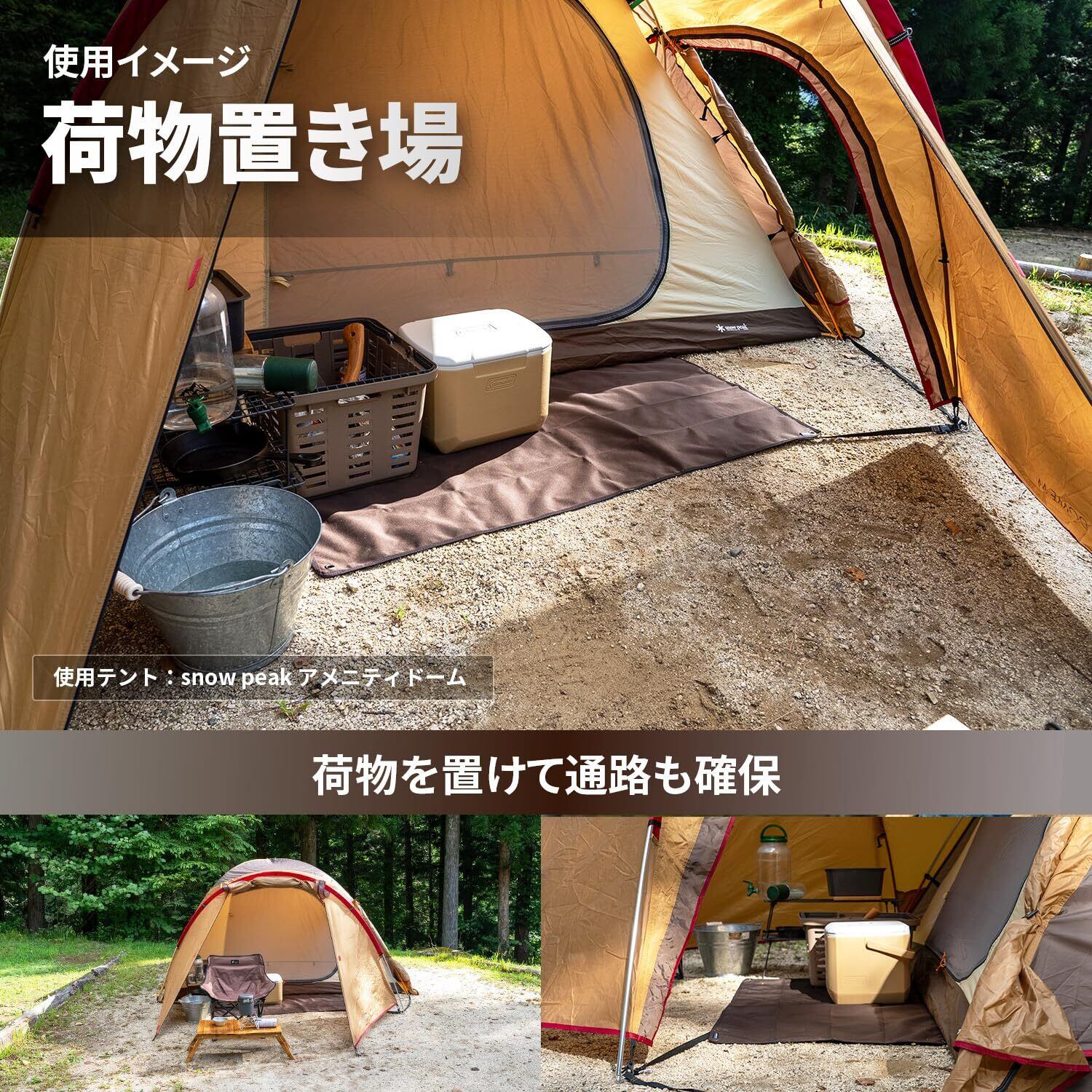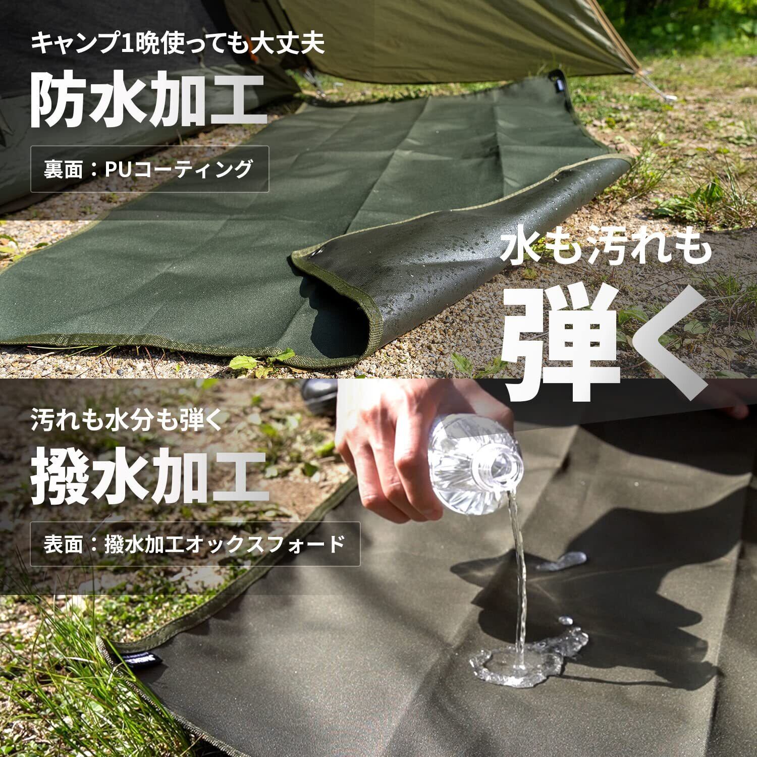 【防水これ1枚でOK】●裏面:キャンプで一晩使っても染みません。ポリウレタンコーティングが地面からの湿気を抑え、裏はびっしょり濡れても表はサラサラをキープ。泥がついても水をかければツルンと簡単に落ちるのでお手入れ簡単です。●表面:撥水性があり、水や汚れをポロポロ弾きます。濡れにくいためシートが水を吸って重くなることも防げます。