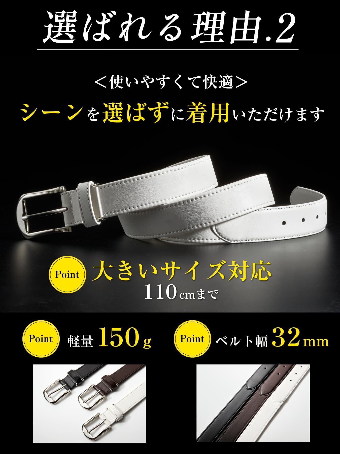 【ギュンギュンのびる素材】見た目は一般的なレザーベルトですが、お腹周りの圧迫感を軽減するストレッチ性に優れた合成皮革を採用したベルトです。ベルト本体が約10cm伸びてくれるのでストレスを感じません。屈んだ時や食後などどんな時でも体に優しくフィットします。