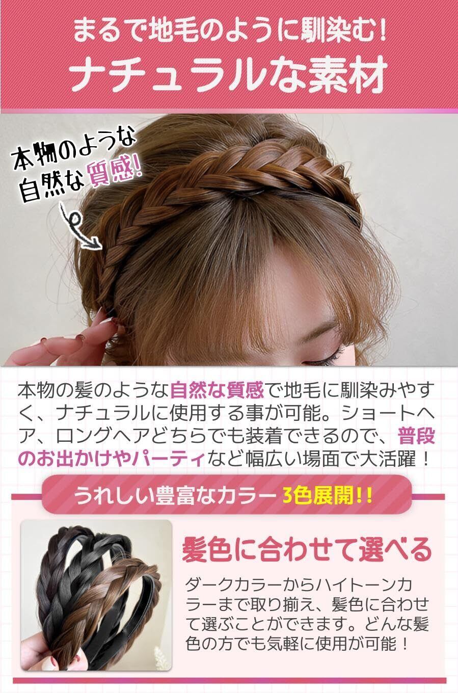 【商品特徴】①選べるカラー3色展開:地毛の色に合わせて選べるカラー展開/②馴染みやすい質感:ナチュラルな質感で地毛に馴染む!/③取り外し楽チン!:カチューシャタイプで装着がとても簡単!/④幅広いアレンジ可能:どんな髪の長さでもアレンジが手軽!