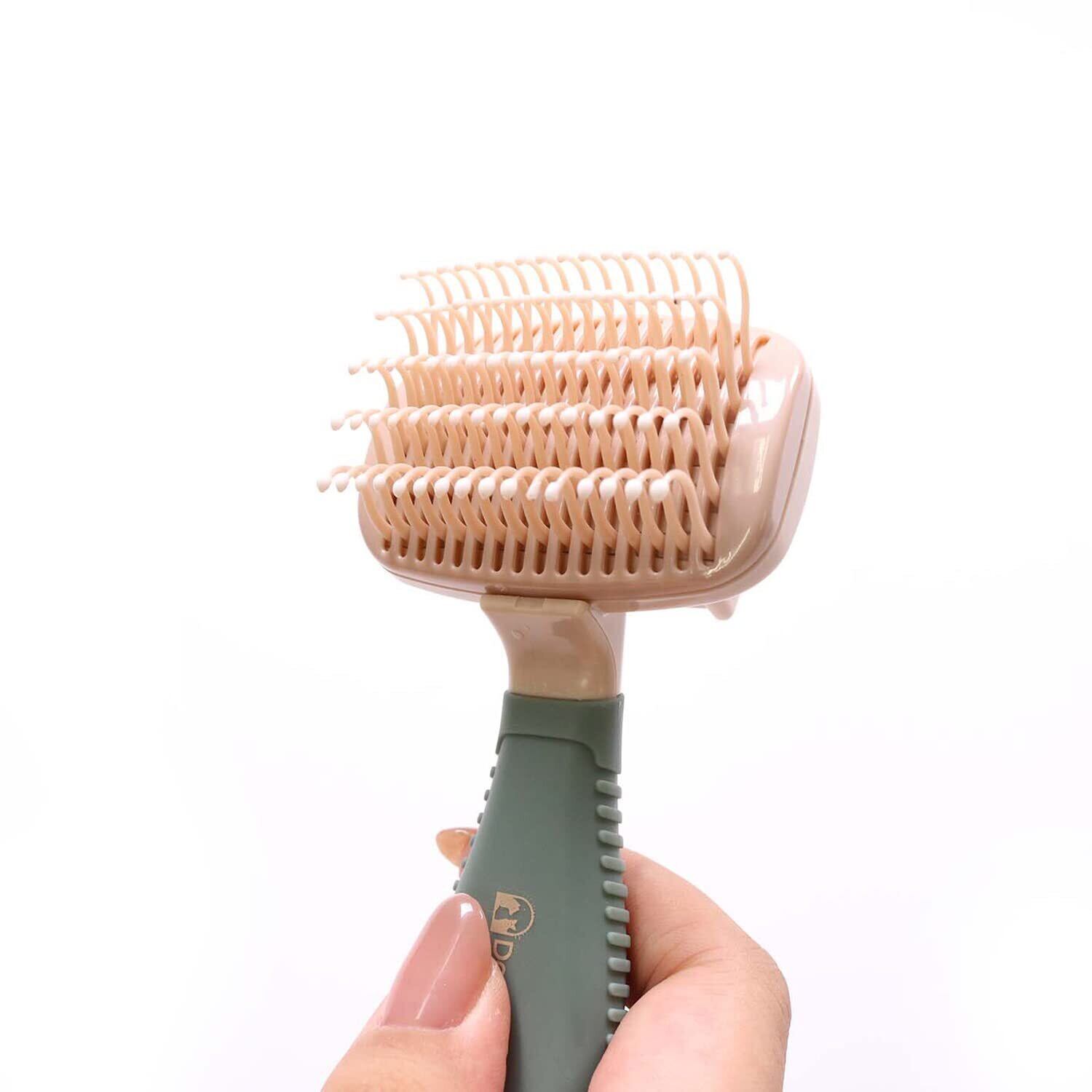 ポリカーボネート製のしなるS字ピンが抜け毛をしっかりかき取るやさしいスリッカーブラシ。