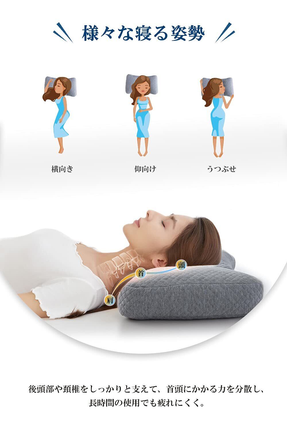【肩こり/首こり対策】人間工学設計と圧力分散に優れた低反発により、体への負担を減少し、しっかりと頭、首、肩をサポートしてくれます。首や頚椎を正常な形にキープして、呼吸がスムーズに出来るほか、寝返りを軽減します。横向き・仰向け・うつ伏せ、どんな寝姿勢でもOK!体圧を均一に吸収・分散して、通常の枕とは比べ物にならない快適さと安定感を提供します。