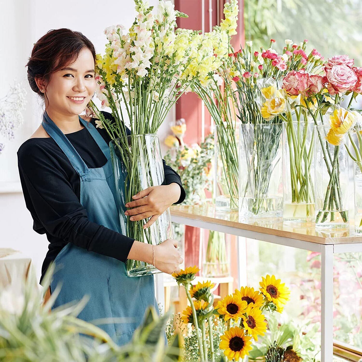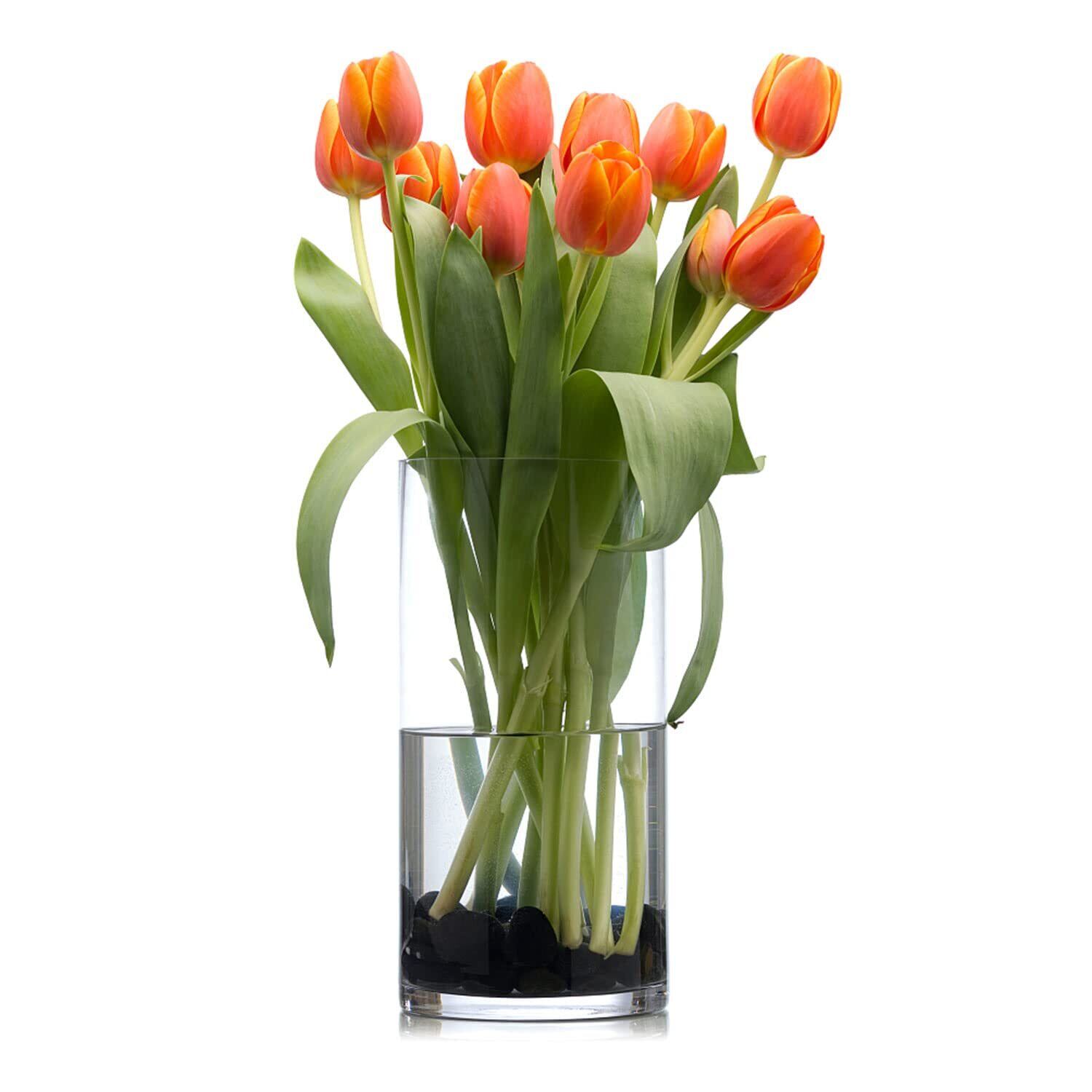 大きいサイズ: 高さ:35cm 直径:12cm このサイズのシリンダーベースは、60〜80cmのブーケ、つる性の花、茎、葉、枝に適しています。例えば、桜、バラ、ユリなどは花瓶にちょうど収まる長さです。