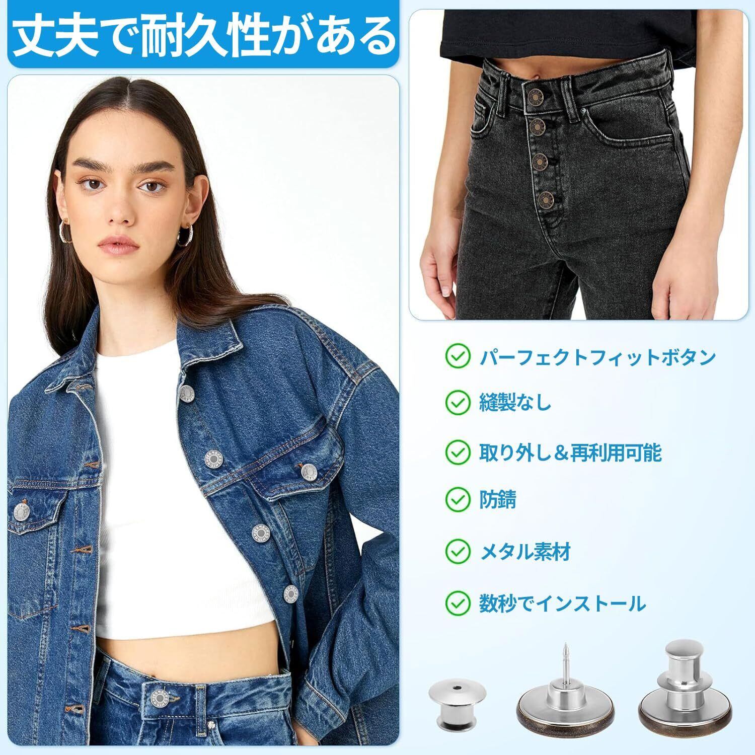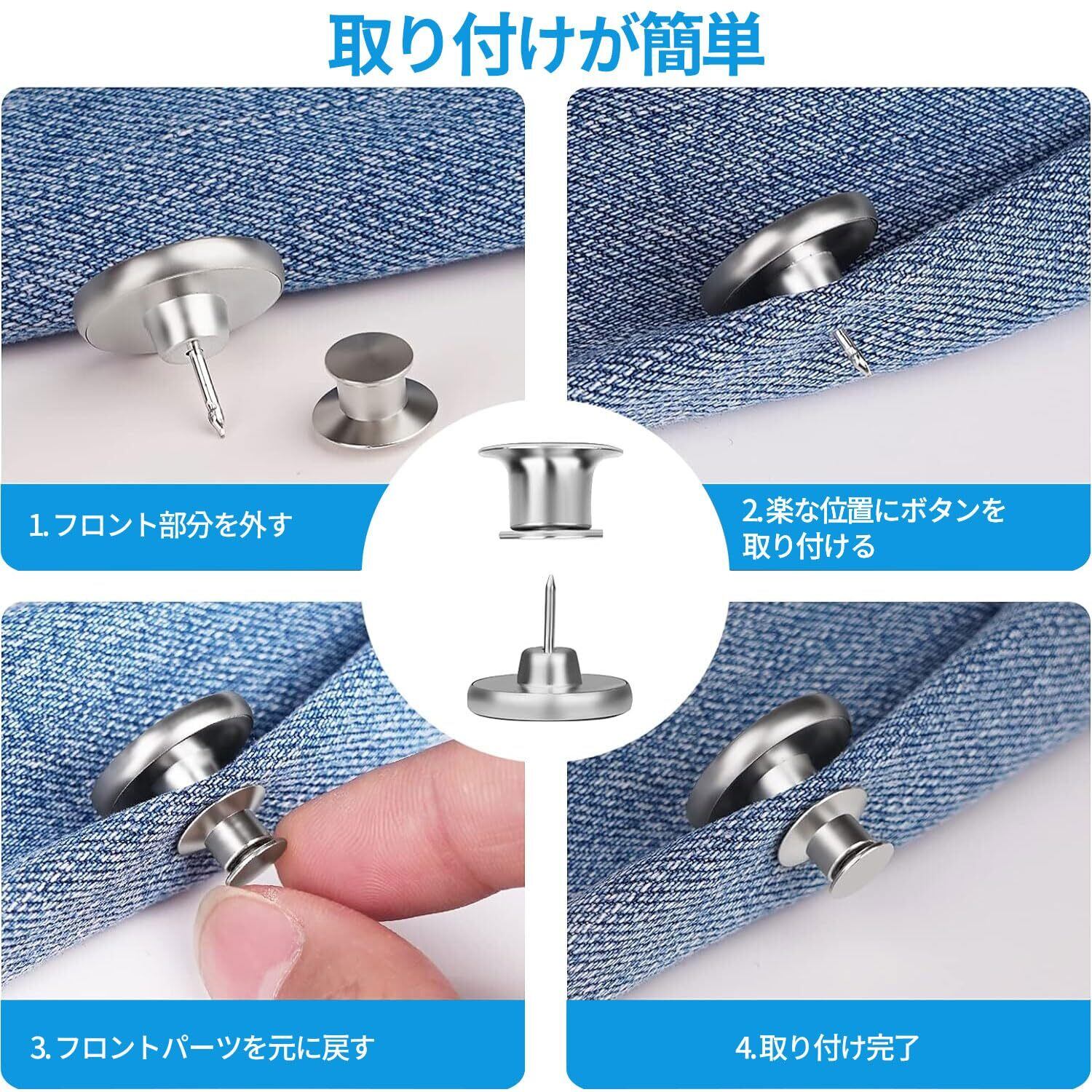【工具不要、縫いなし、交換簡単】工具不要、縫製不要、取り付けがとても簡単なので、誰でも使用できます。厚手のデニム生地でも簡単に刺して取り付けられ、衣服に取り付けるのに縫製は必要なく、後ろカバーを引っ張ると自由に取り外しできます。繰り返し使用することができますので、ジーンズのボタンピンを外したいときに、工具不要で簡単に外せ、新しい洋服に再利用できます。