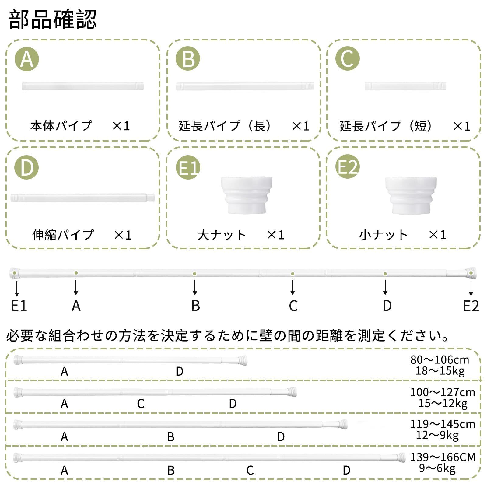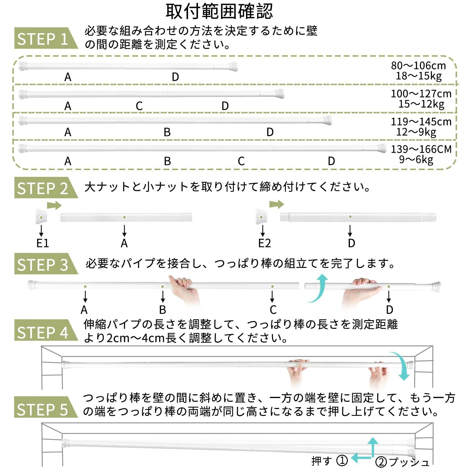 80cm~166cmの両壁距離を対応でき、つぎ合せ式のつっぱり棒は対応できる距離が長いだけなく、運賃を減らすので、さらにお得になります。