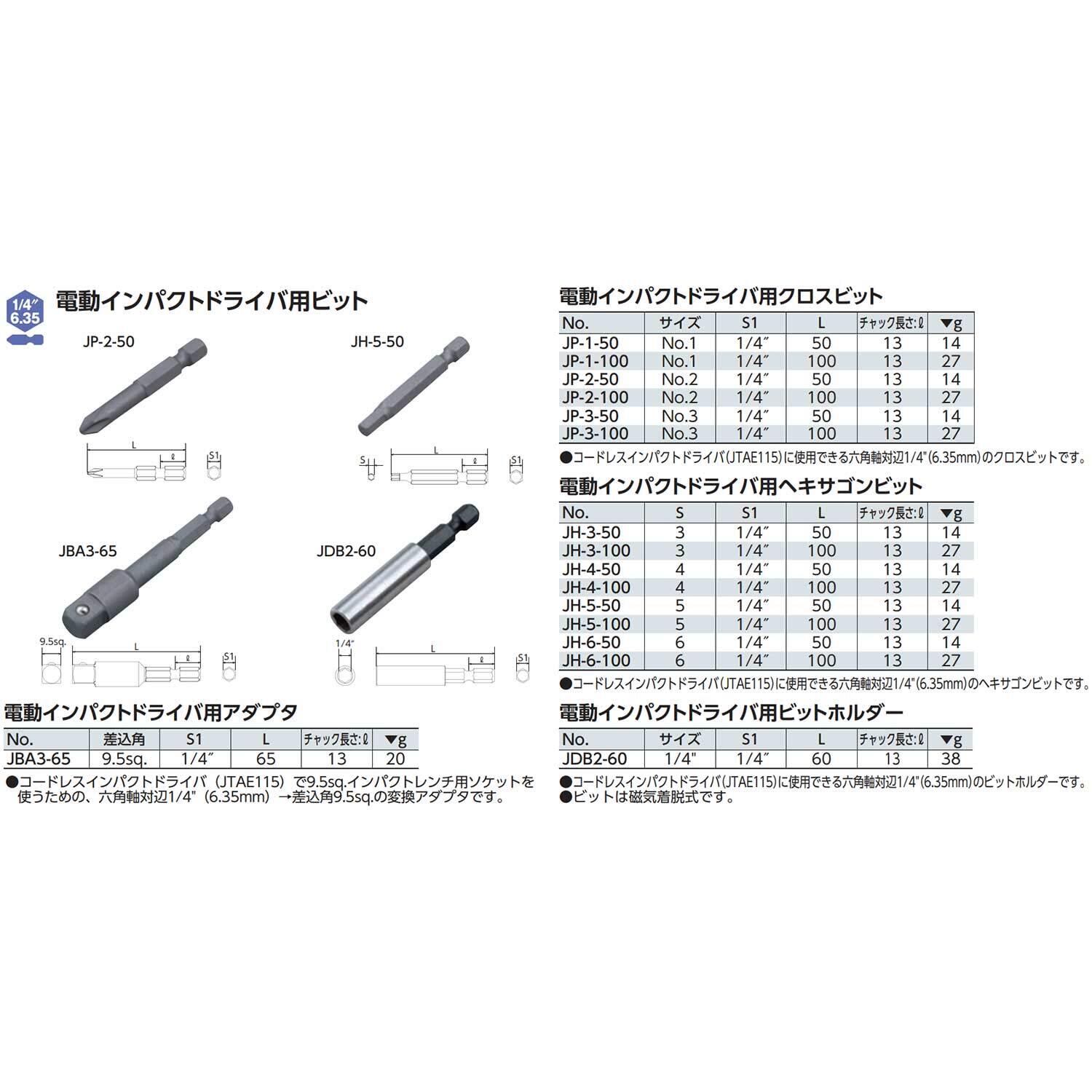 ●コードレスインパクトドライバ(JTAE115)に使用できる六角軸対辺1/4"(6.35mm)→差込角9.5sq.の変換アダプタ
