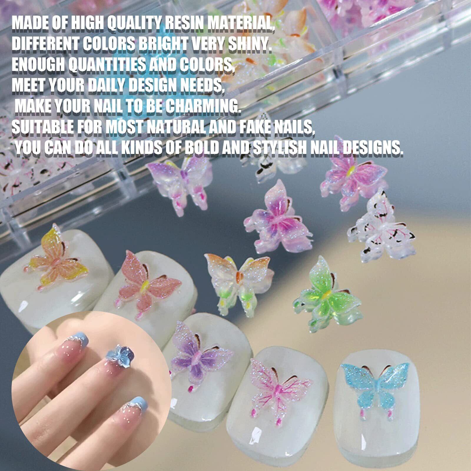 【蝶々ネイルパーツ】夜光の効果がある蝶ネイルパーツです。蝶パーツはカラフルーでおしゃれです。ネイルのワンポイントにぴったりの可愛いパーツになっております。 【素材】ネイルパーツは樹脂素材で作られて、立体感があり存在感が抜群です。軽量で、使いやすく、耐久性があります。季節を問わず幅広くお使いいただけます。 【ネイルアートに】ネイルにのせるだけで、可愛い印象のネイルアートができます。セルフネイルまたはネイルサロン使用に適しています。 【多用途】ネイルだけではなく、スマホカバーの飾り、レジン封入、ハンドメイドのアクセサリーにもご利用いただけます。 【パッケージ】蝶のネイルパーツ1ケース入り(約60個)。使いたい分だけ取り出せる便利なケースが付いています。