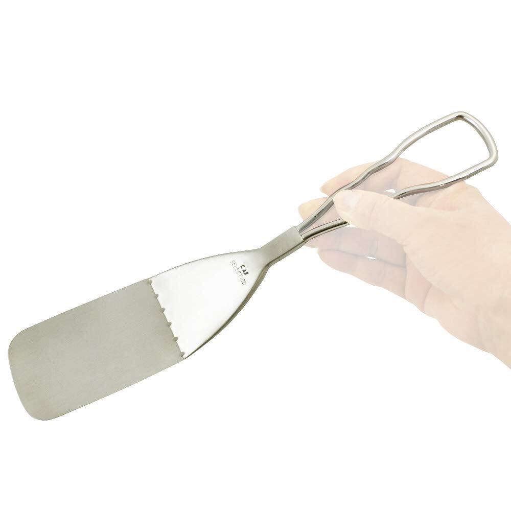 食材を返すだけではなく、身が縮んで反りかえりやすい食材(肉や魚)を押さえるのにも便利なターナー