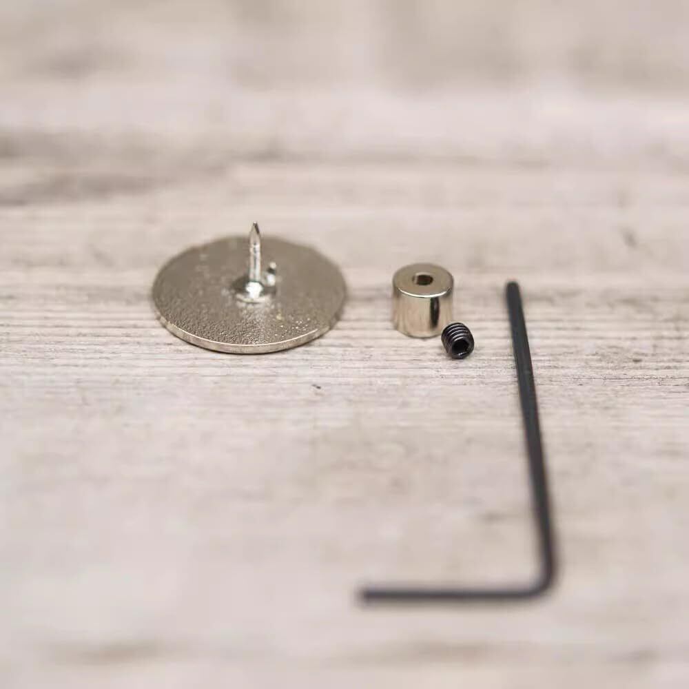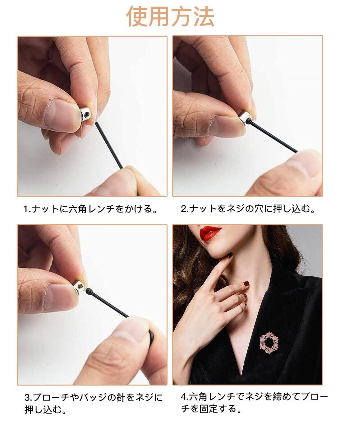 【取り付け簡単】内六角レンチを使用して黒いねじを留め具の側面の穴に半分差し込み、バッジまたはブローチを中央の穴に挿入し、その後黒いねじを締めて留め具を固定します。