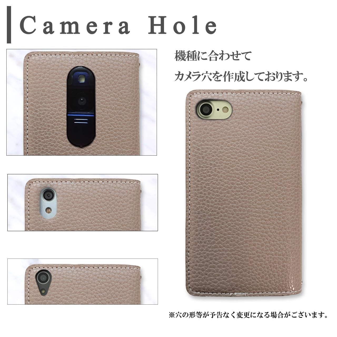 手帳部分とケース部分は接着しておりますが、強くめくると剥がれる場合がございます。カメラ穴周りは形状上接着をしておりません。