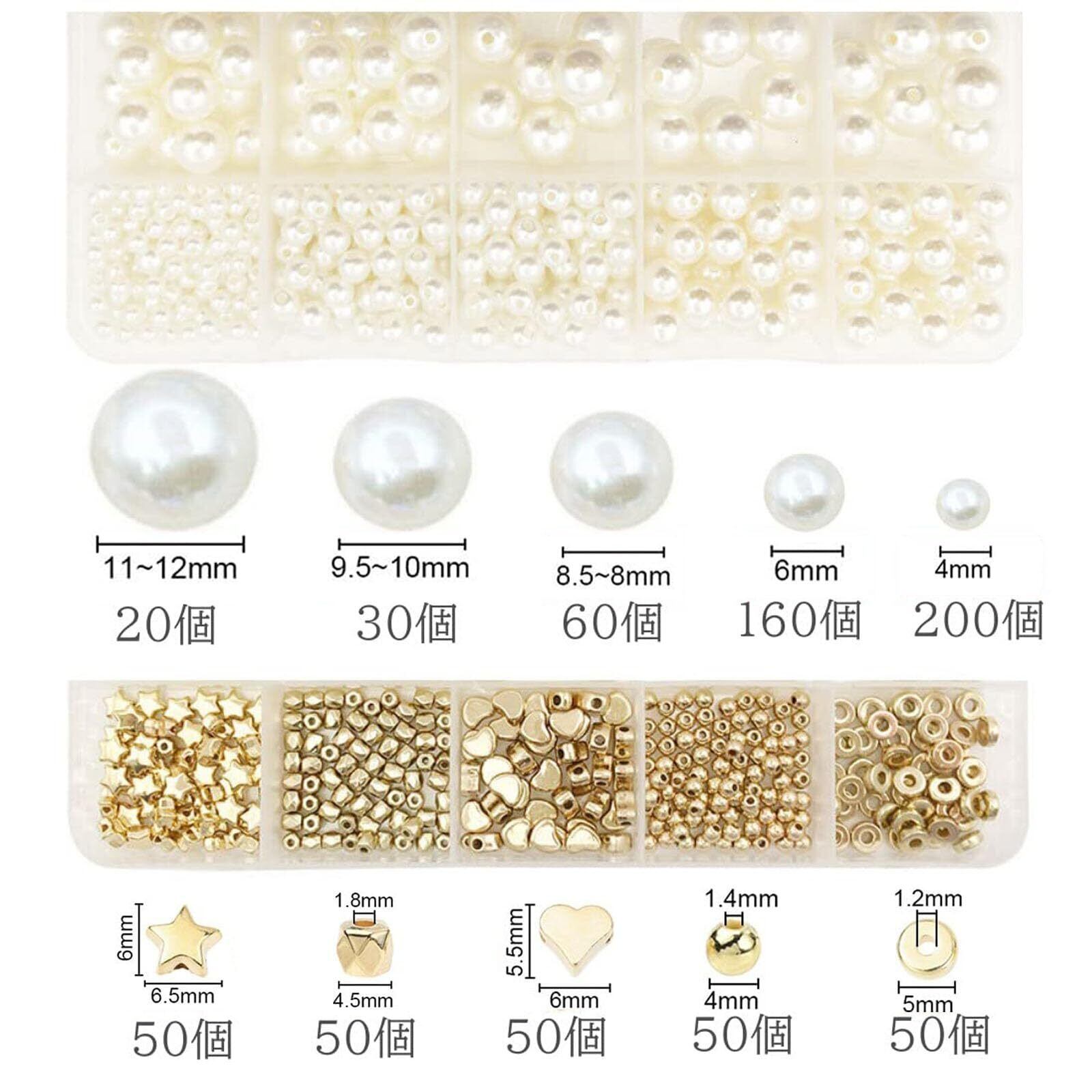 【サイズの多様性】5種類のサイズの真珠と5種類のデザインのアクセサリーがあり、サイズバリエーションとスペーサーが豊富なので、いろいろなアクセサリー作成にピッタリです。