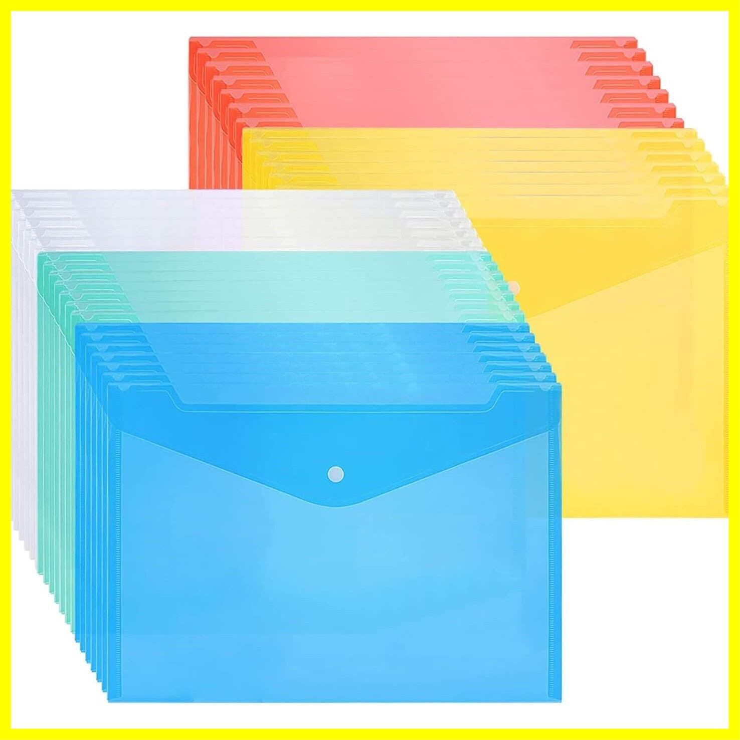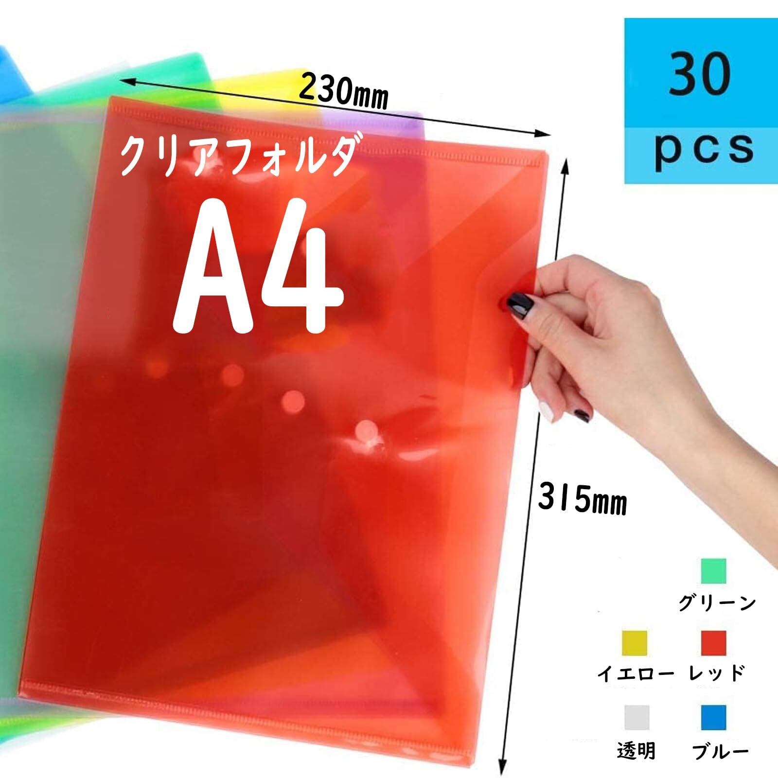 クリアファイルバッグ A4 ボタン式 クリアホルダー クリアファイル ファイル収納 封筒型ファイル 透明カラー 5色 30枚セット 書類整理 資料収納 書類保護
