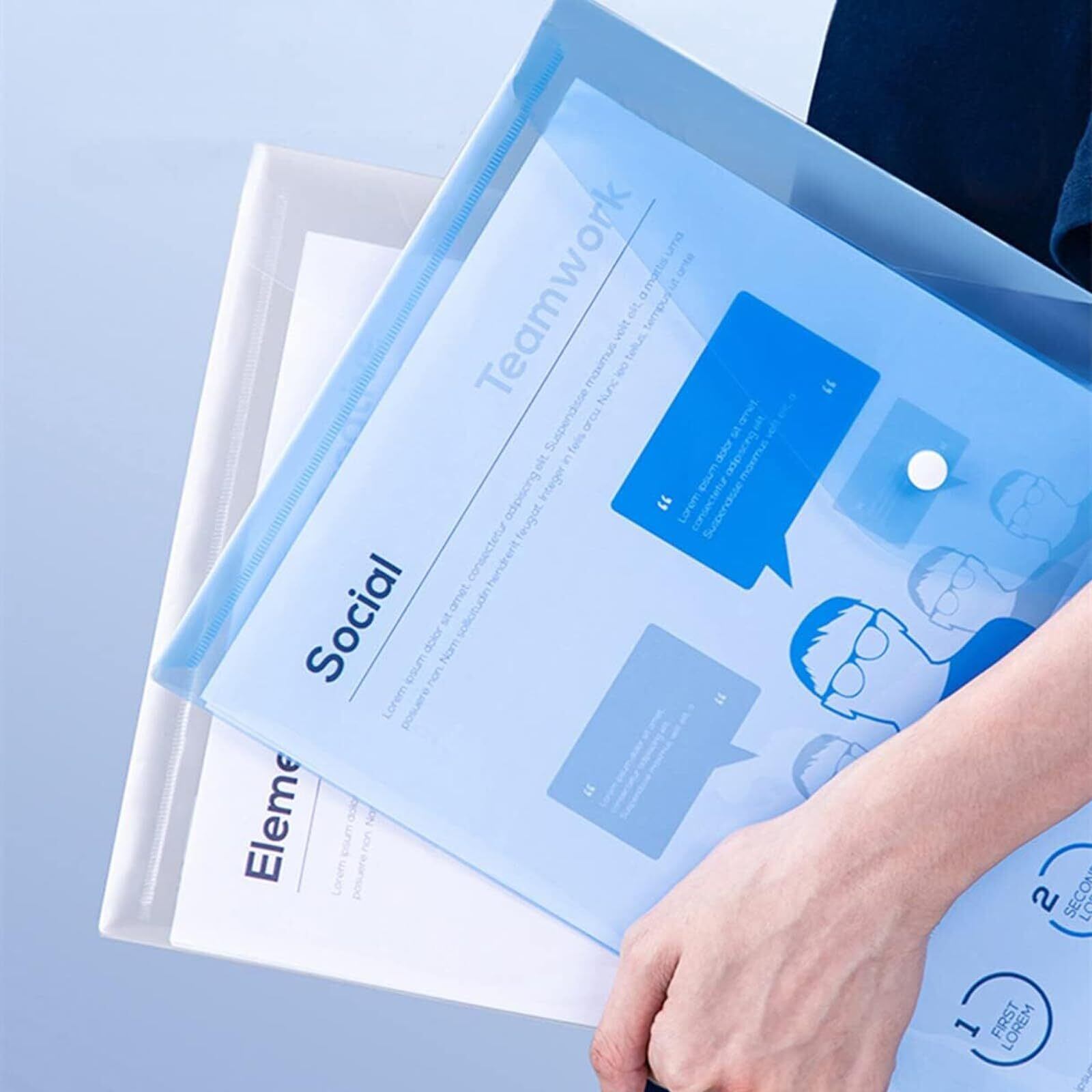 透明カラーで中身がよく見え、外出先で手に取ってもブリーフケースに入れてもファイルを保護し、ファイルの破損を防ぐことができます。会社の企画書、報告書、発表資料などの重要書類の保管や整理、家庭においても、各科目の印刷整理や連絡帳の汚染防止などのために。