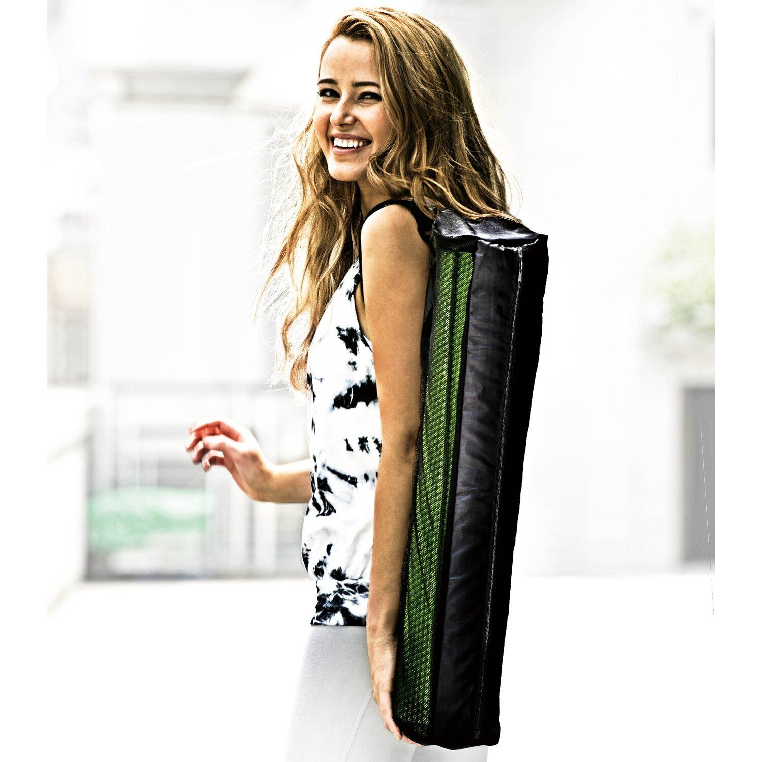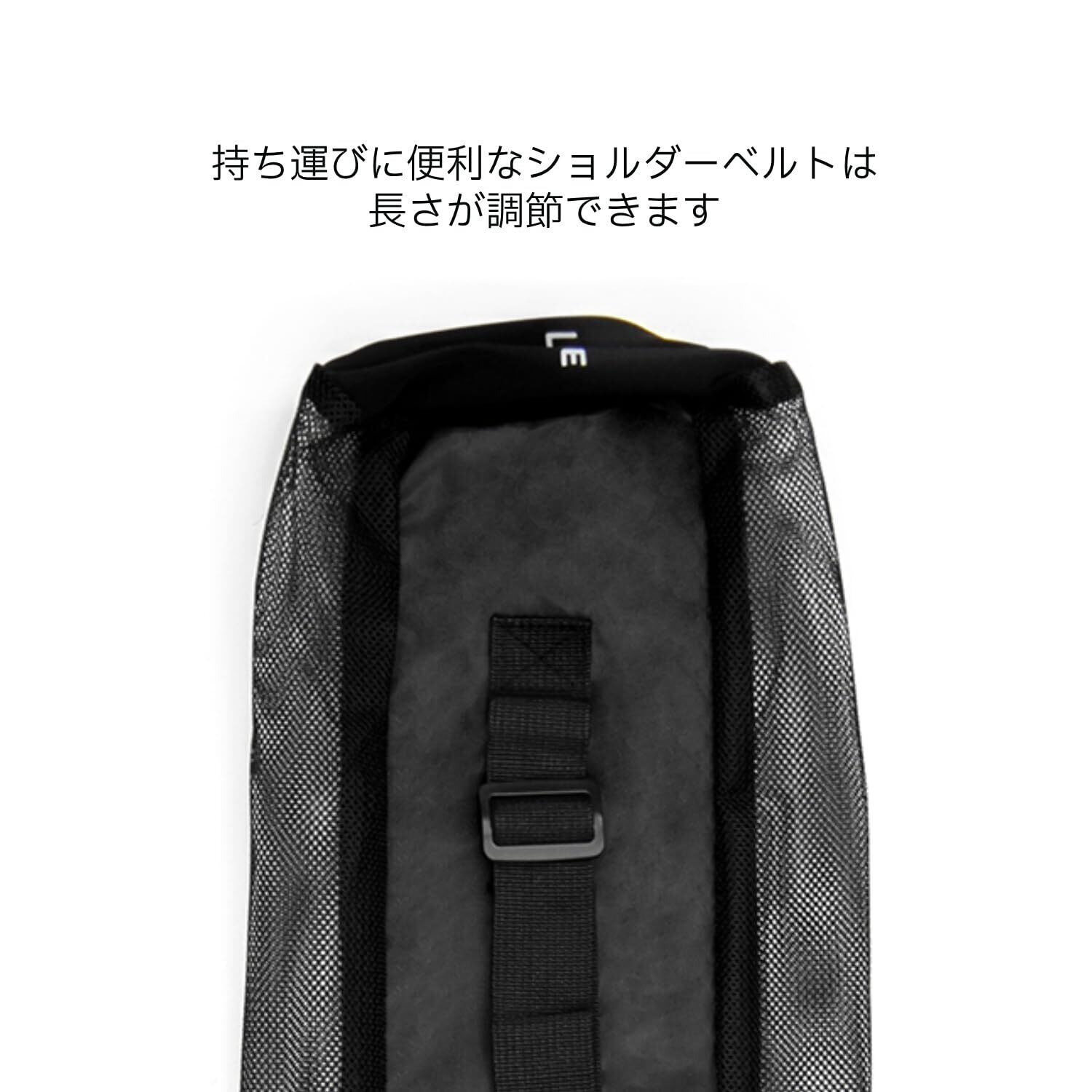 ブラックカラーのシンプルなデザインは、性別や年齢を問わず使いやすく、インテリアにもなじみやすい印象。ヨガマットがメッシュからちらっと見えるのもおしゃれなポイント。ケース単体での販売です。