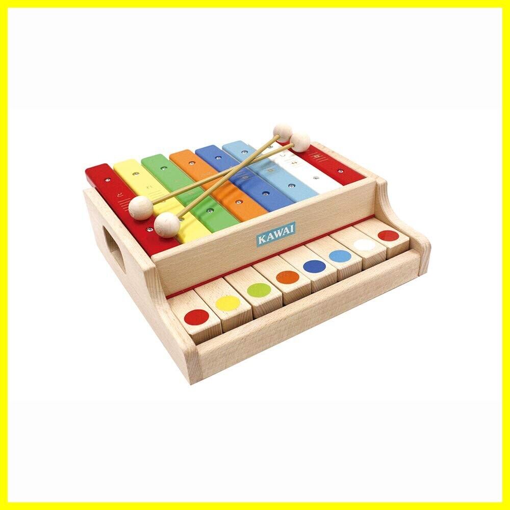 バチで音板を叩いて木琴としても遊べるハイブリッド設計です。バチ2本と鍵盤用8色シールが付属します。