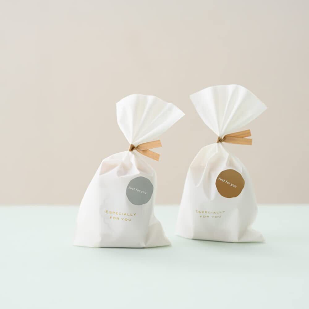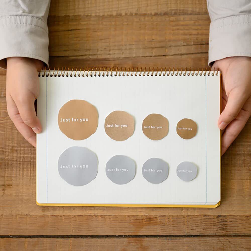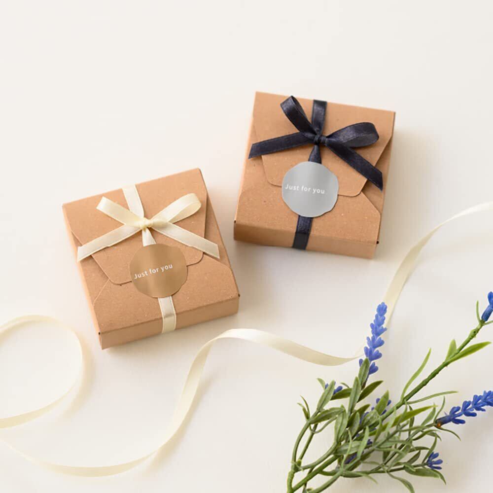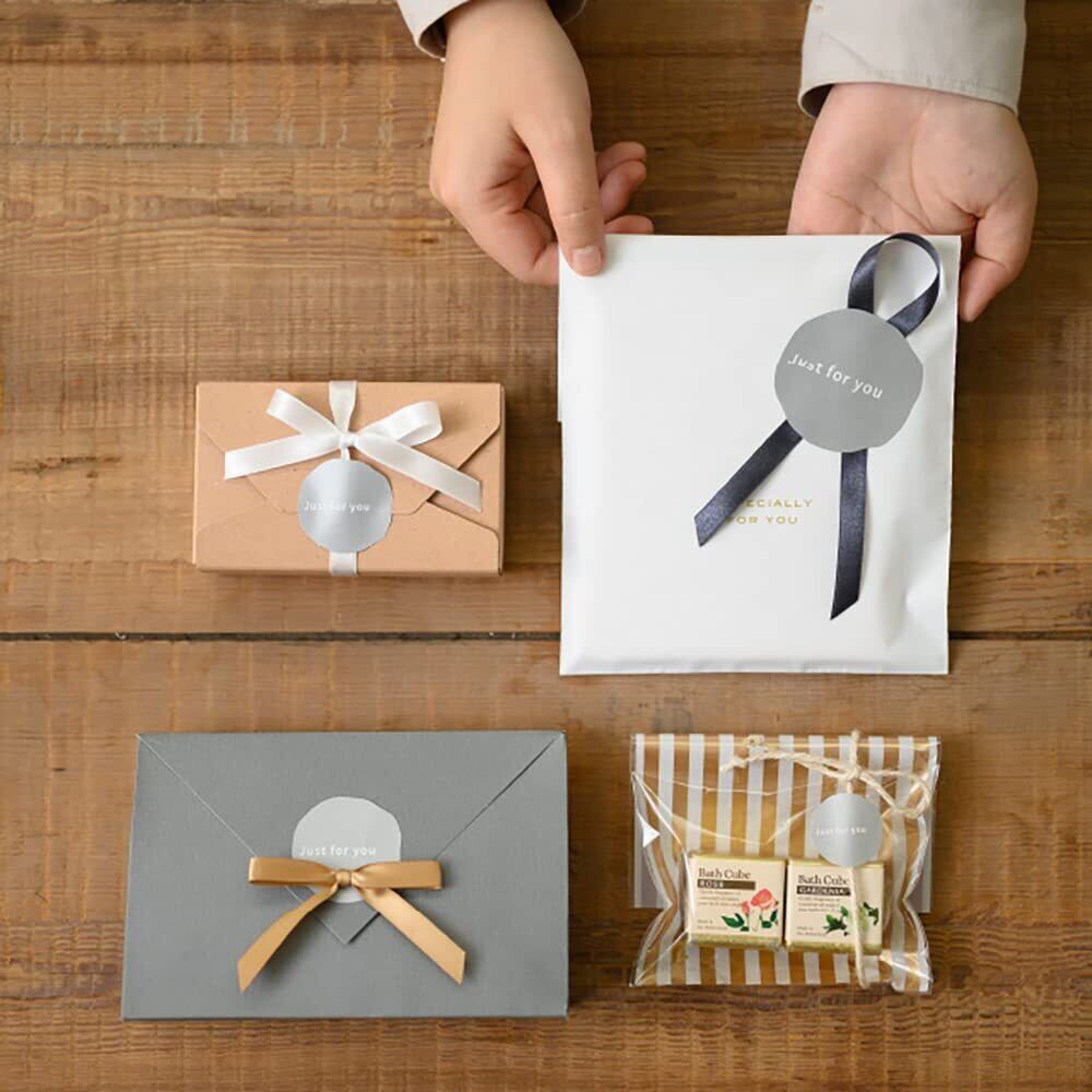 フリーハンド風のゆるい曲線がかわいい丸型のギフトシールです。渋い色味のマットシルバーに「Just for you」のメッセージが入ったシンプルなデザインがおしゃれ! 貼るだけでスタイリッシュなギフトラッピングが作れます。ゆらぎのある円形なので、貼付時に少し傾いても自然な感じに仕上がるのもポイントです。はがれやすい梨地素材にもお使いいただける強粘着タイプのギフトシールです。