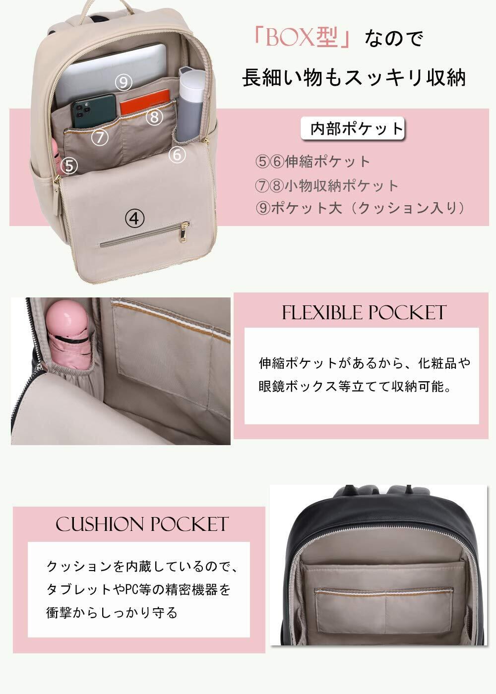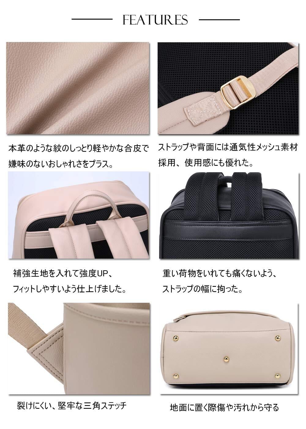【パソコンが入るリュック】 上質な合皮 レザー素材を使用したキレイめな女性向けリュックサック。 パソコン収納スペースも備えられ、14インチ以下のノートPCもスマートに収納できます。 洗練されたデザインと防水性の組み合わせで、ビジネスシーンやカジュアルな場面にもぴったりです。