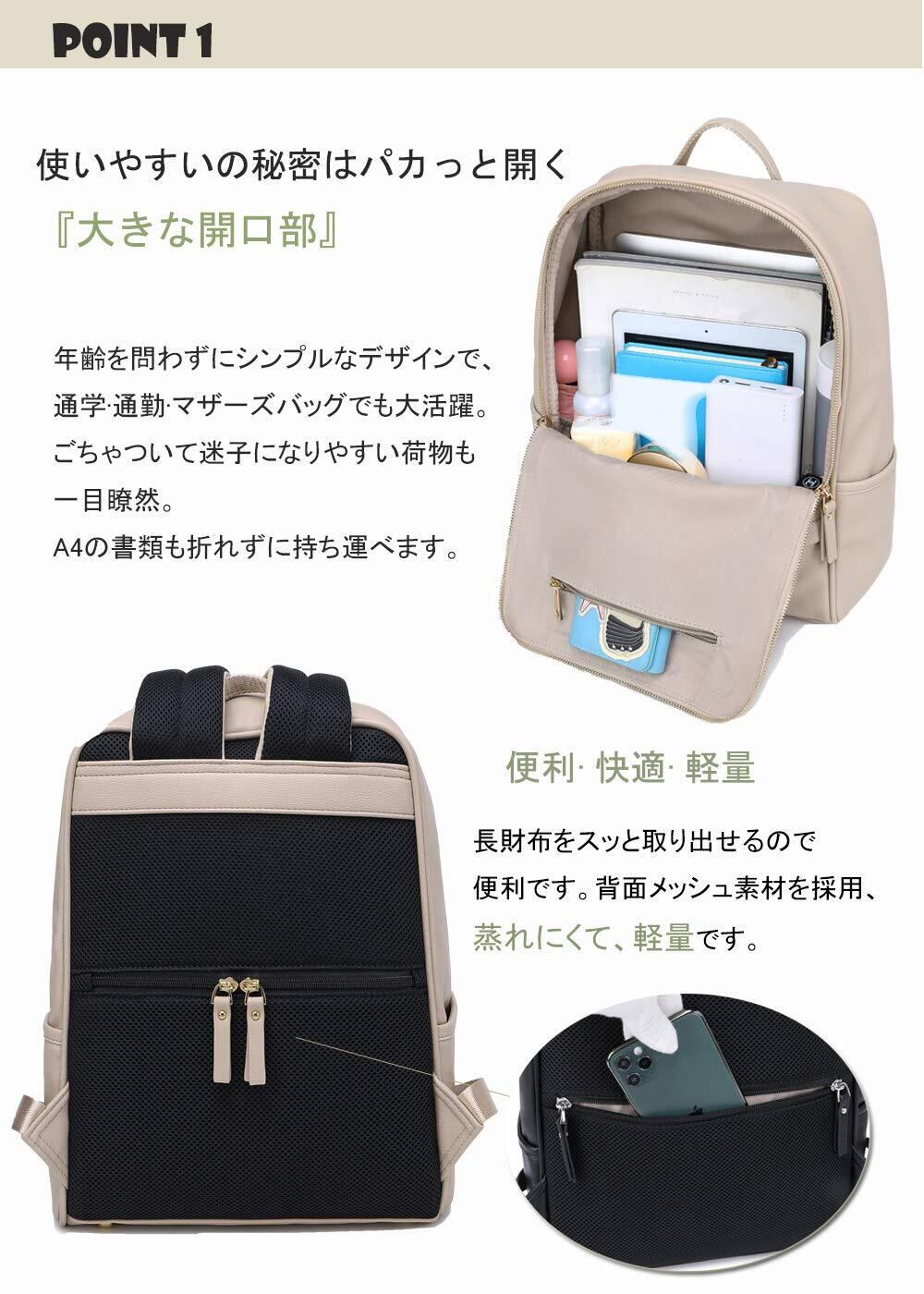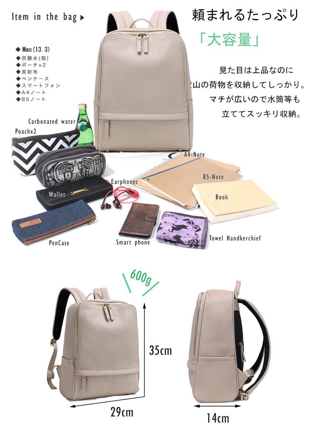 大容量ながら1泊2泊分の荷物が収納可能なバックパック。 A4雑誌や書類、タブレットやノートPC (14inch以内) はもちろん、ドリンクボトルやランチボックス、冷房対策の上着やひざ掛けなどのかさ張る荷物も全て収納可能。 合皮素材の上品なデザインと防水性が特長で、旅行や出張にも最適です。