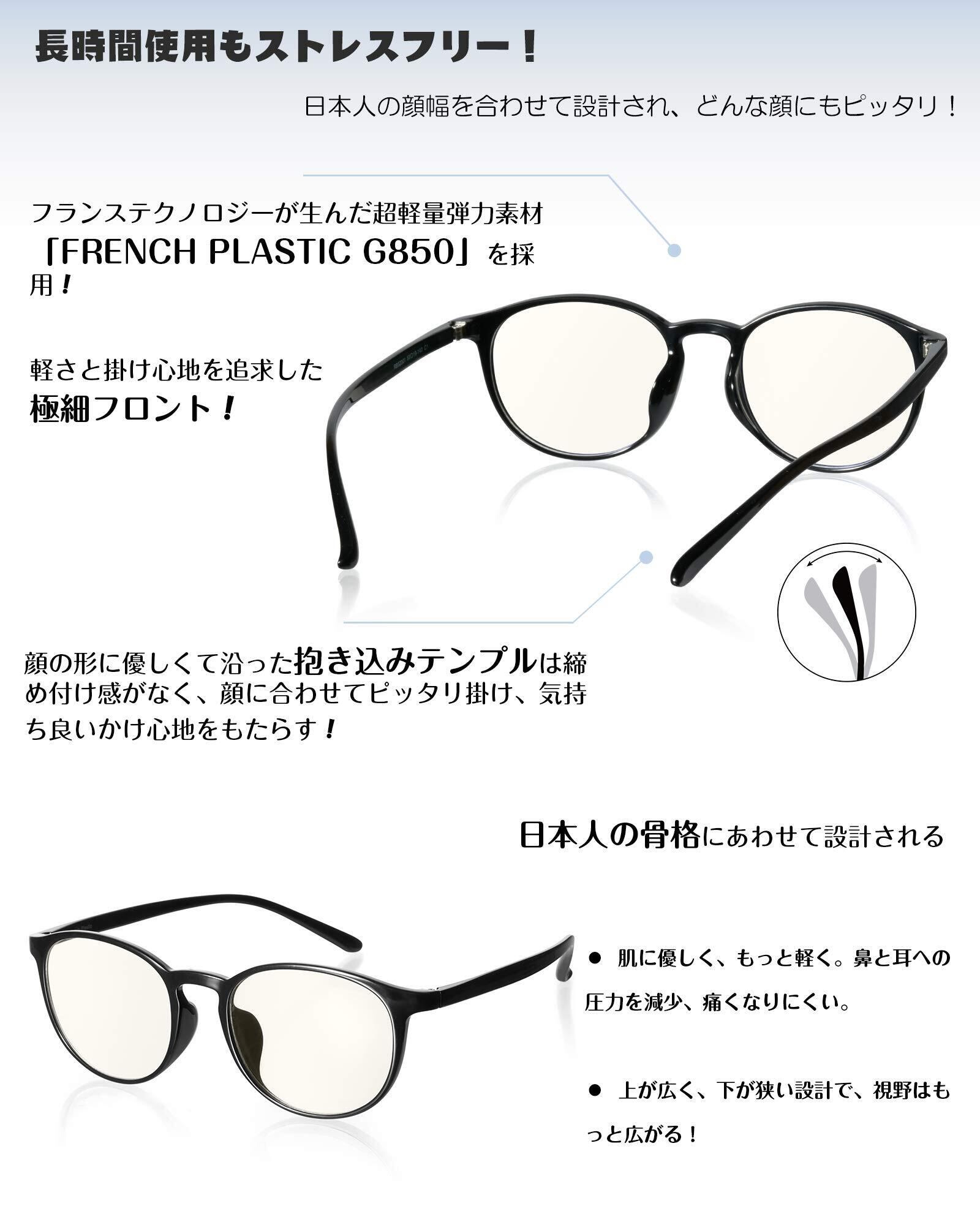 【超軽い掛け心地】超軽量弾力「FRENCH PLASTIC G850」材質を採用し、思ったよりすごく軽くて圧迫感もなく快適な掛け心地!毎日使ってももちろん!日本人の顔幅を合わせて設計され、どの顔にも気楽に掛けられる!