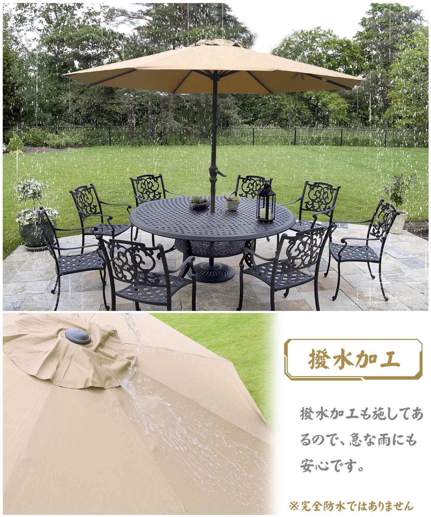 撥水加工:ガーデンパラソルは水や汚れに強い撥水加工、雨に濡れても水を弾くので、雨漏れする心配はありません!お手入れもサッと拭くだけで簡単