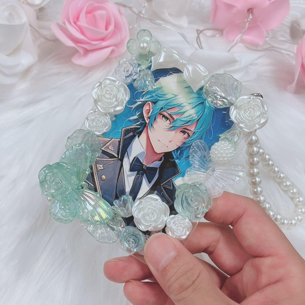 パールストラップ付き硬質ケースデコ B8 推し活 オタ活 ハンドメイド KPOP アニオタ 写真入れ グリーン 緑 推し活グッズ