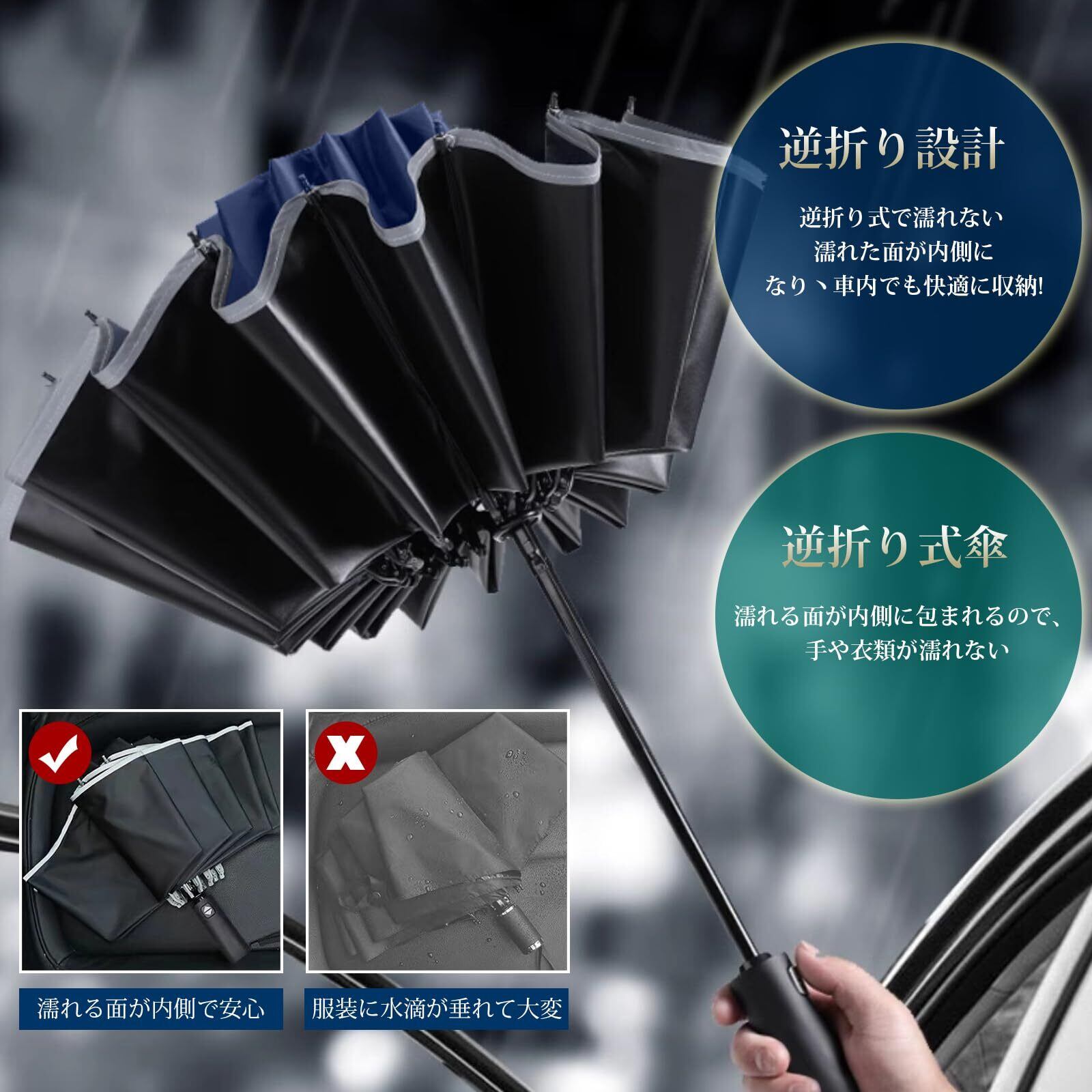 【逆折りたたみ式傘】通常のメンズ折り畳み傘と違う、畳んだ時に濡れた面が内側になるので衣服やバッグ、車内が濡れないので、その逆折傘の魅力です。ワンタッチで自動開閉に畳める、荷物を持っていてもらくて簡単、巻き取る時も手が濡れも心配はありません。
