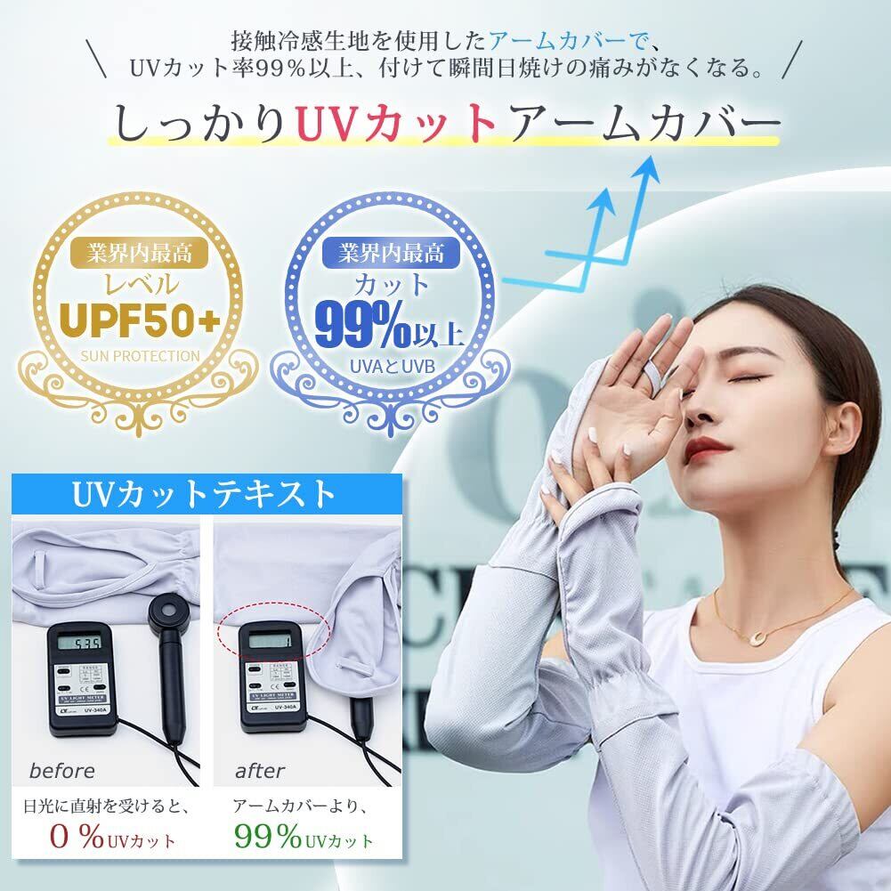 【UVカット・接触冷感アームカバー】接触冷感生地を使用したアームカバーで、接触冷感−5℃ !瞬間冷感機能を実現。検査機関のUV遮蔽率測定試験で証明済み、業界最高レベルUPF50+でカット、UVカット率99%以上。高エネルギーの紫外線を強力に吸収し、太陽の有害な損傷から腕を最大限に保護できる紫外線吸収剤で処理されます。総丈55cm丈で、長くて、夏場は袖が短い服を着いても指先から腕まで日焼けからガードできます。