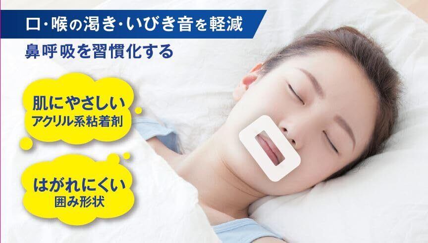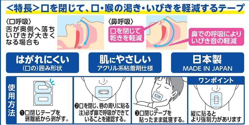 「口を閉じて、口・喉の渇き・いびきを軽減するテープ」。