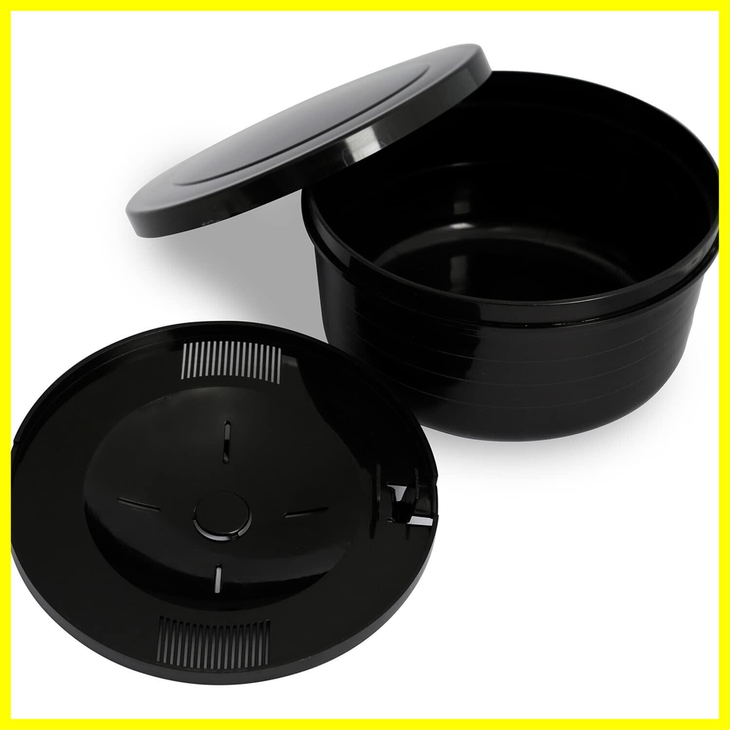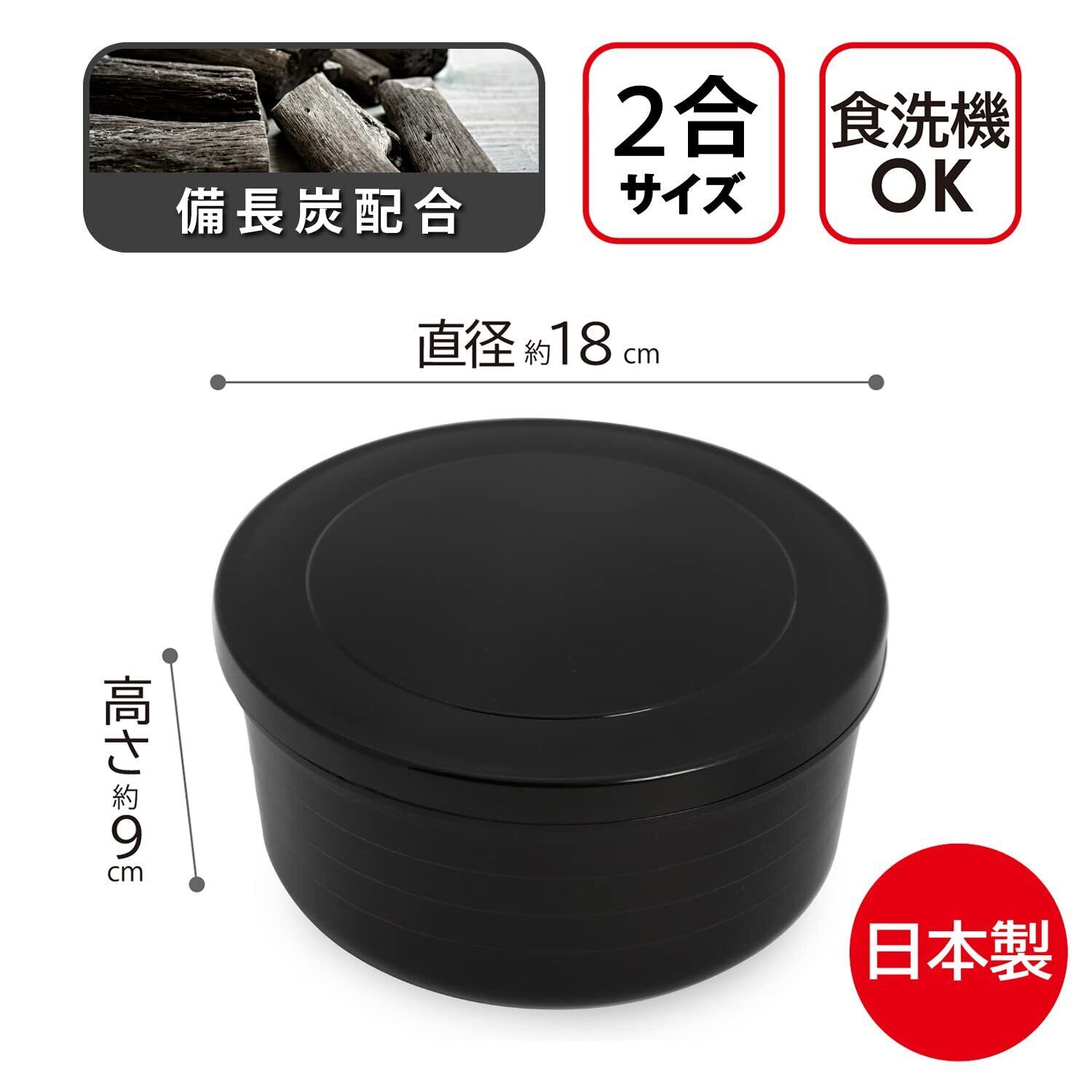 【商品仕様】:サイズ/約直径18×高さ9cm、内容/1個、カラー/ブラック、容量/2合用(1300ml)、材質/ポリプロピレン(備長炭配合)