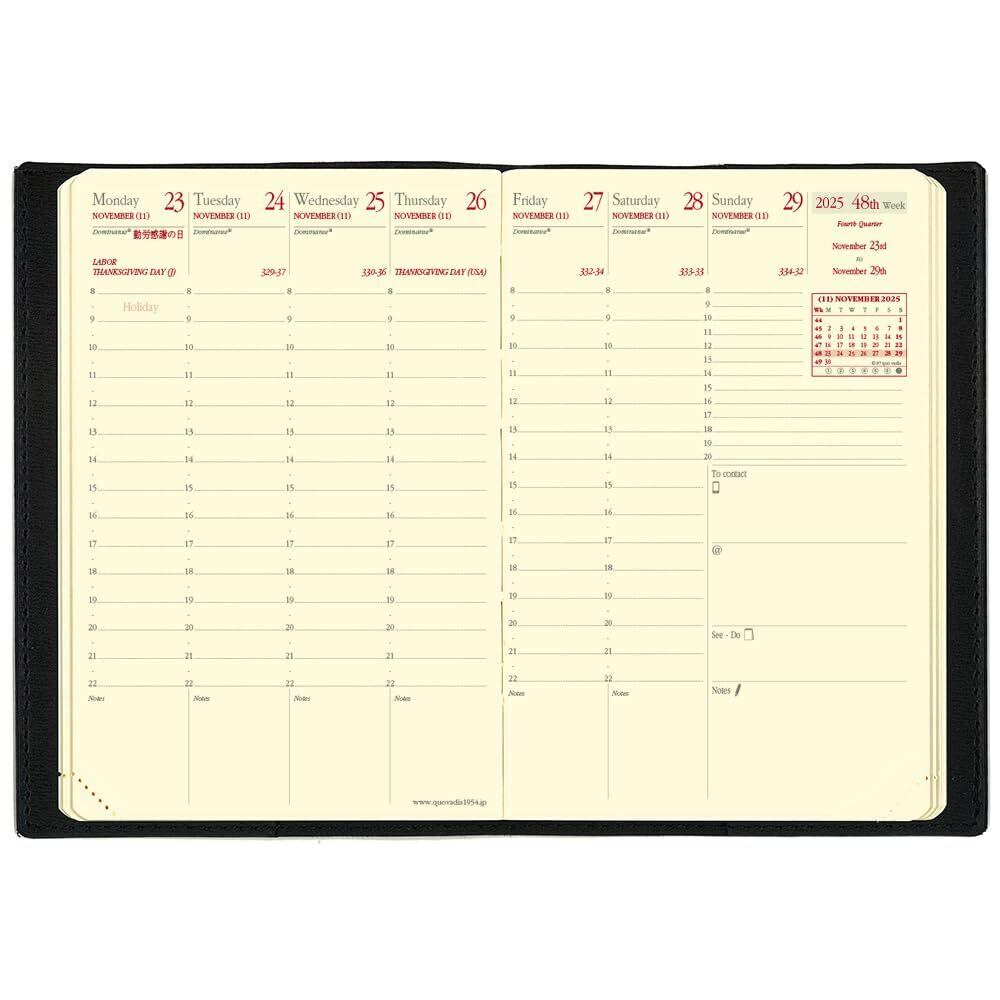 手に馴染むサイズに、曜日ごとに設けられたノートスペースが便利な手帳です。エレガントなアイボリーペーパー。