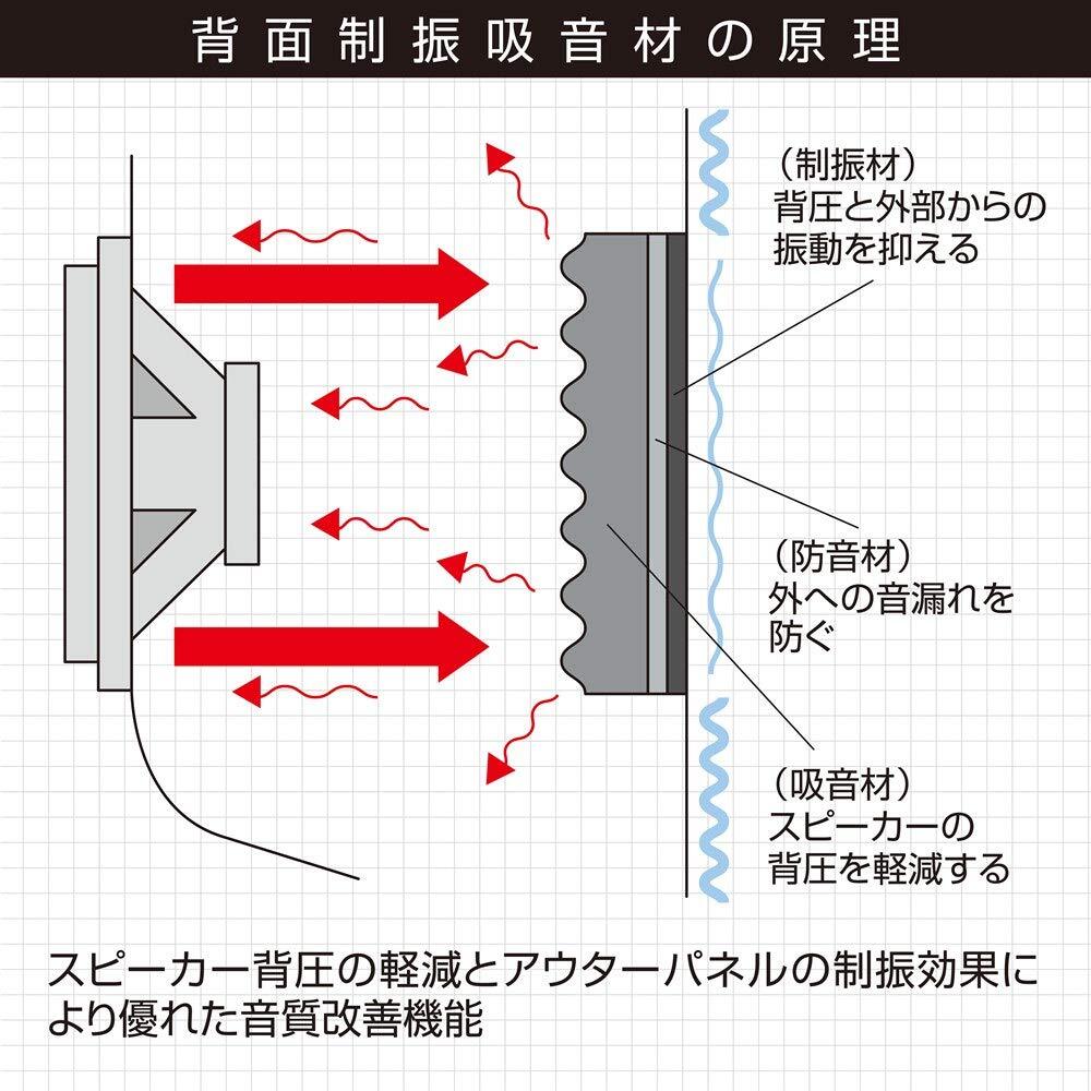 吸音材・防音材・制振材・によるオリジナル3層構造が、スピーカー背面で発生する音の反射を抑制。ノイズ・音漏れを低減させハッキリしたサウンドに。