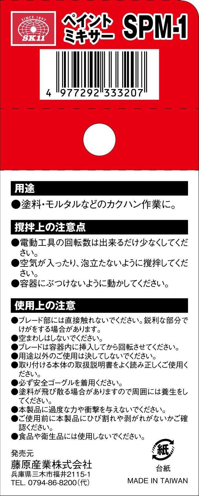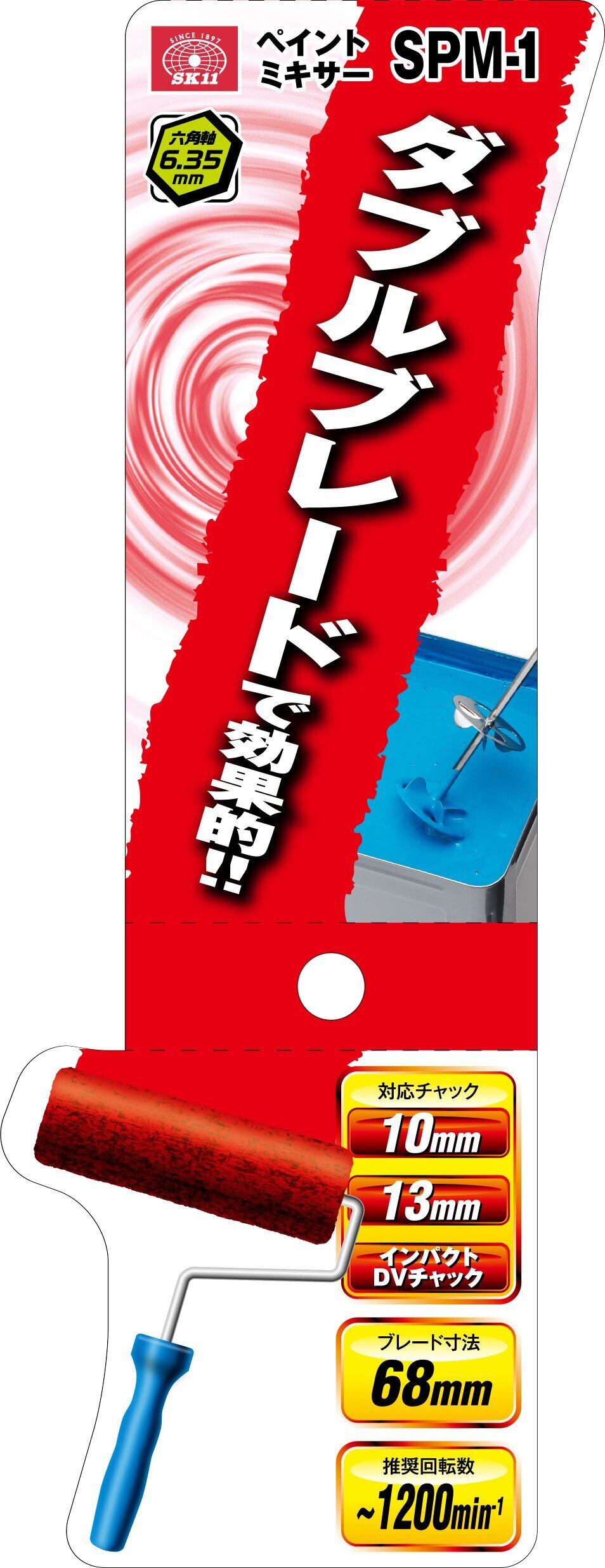 SK11(エスケー11) ペイントミキサー 六角軸 300mm 羽径68Φ SPM-1