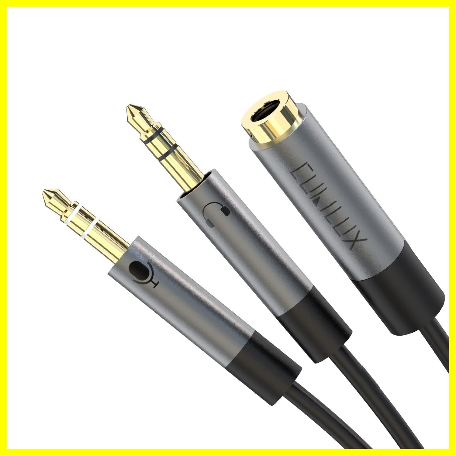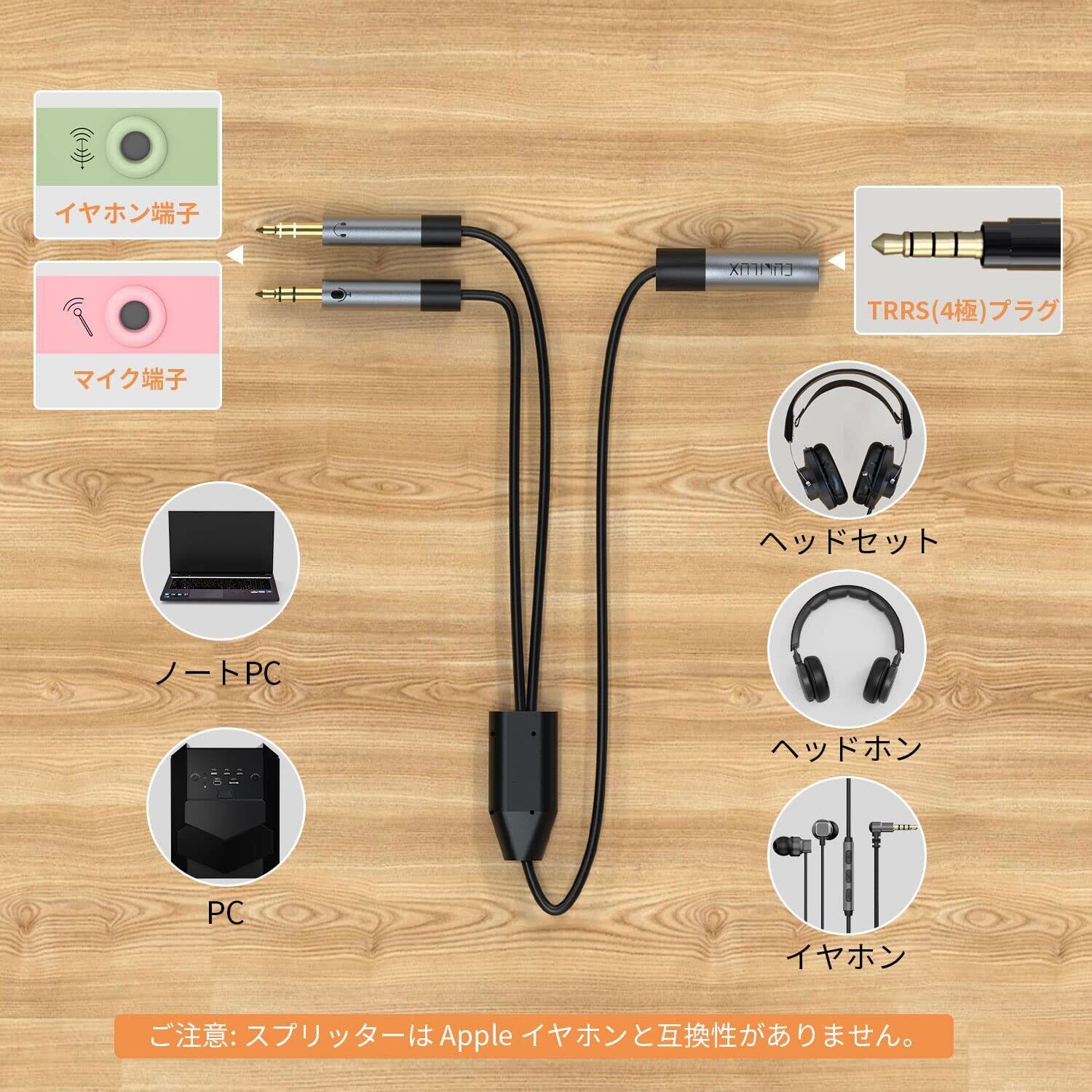 [3.5mm オーディオ & マイク スプリッター] – マイク内蔵の TRRS PC ヘッドセットまたはマイク付きイヤホンを、ヘッドフォンとマイク ジャックが分離されたコンピューターに直接接続します。