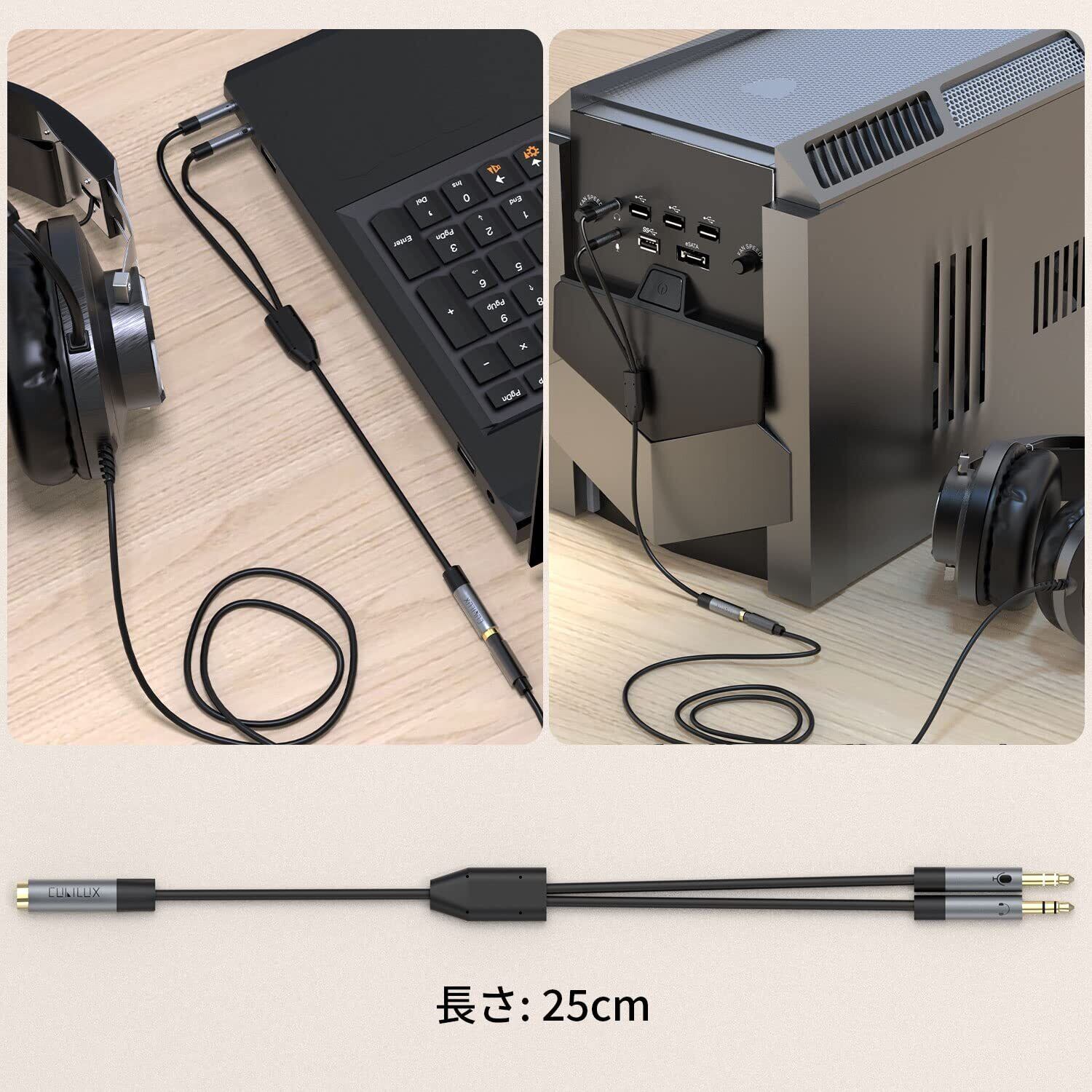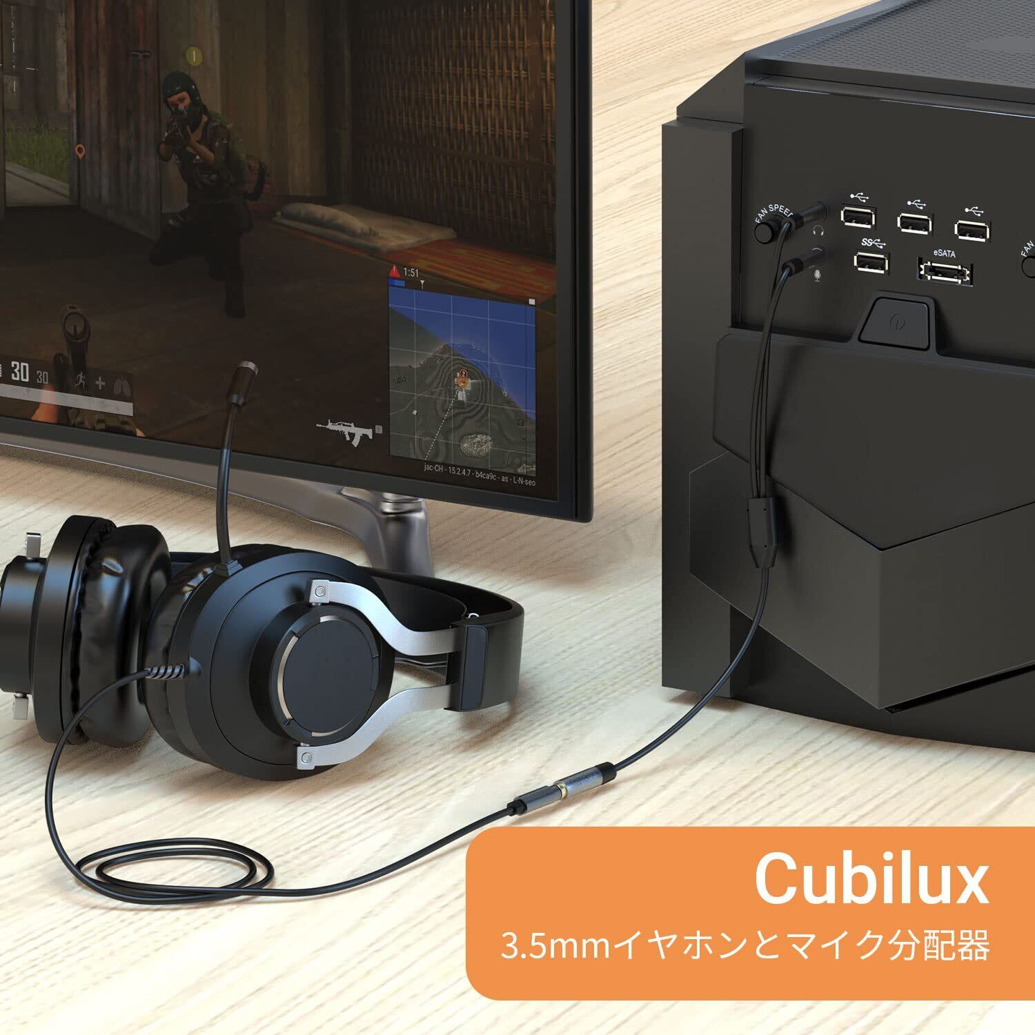 Cubilux 3.5mmイヤホン2分配器、4極(TRRS)(CTIA)メス3極(TRS)オスイヤホン マイク変換アダプタ、ヘッドフォン端子分岐スプリッター、PC、パソコ、コンピュータに対応、25cm