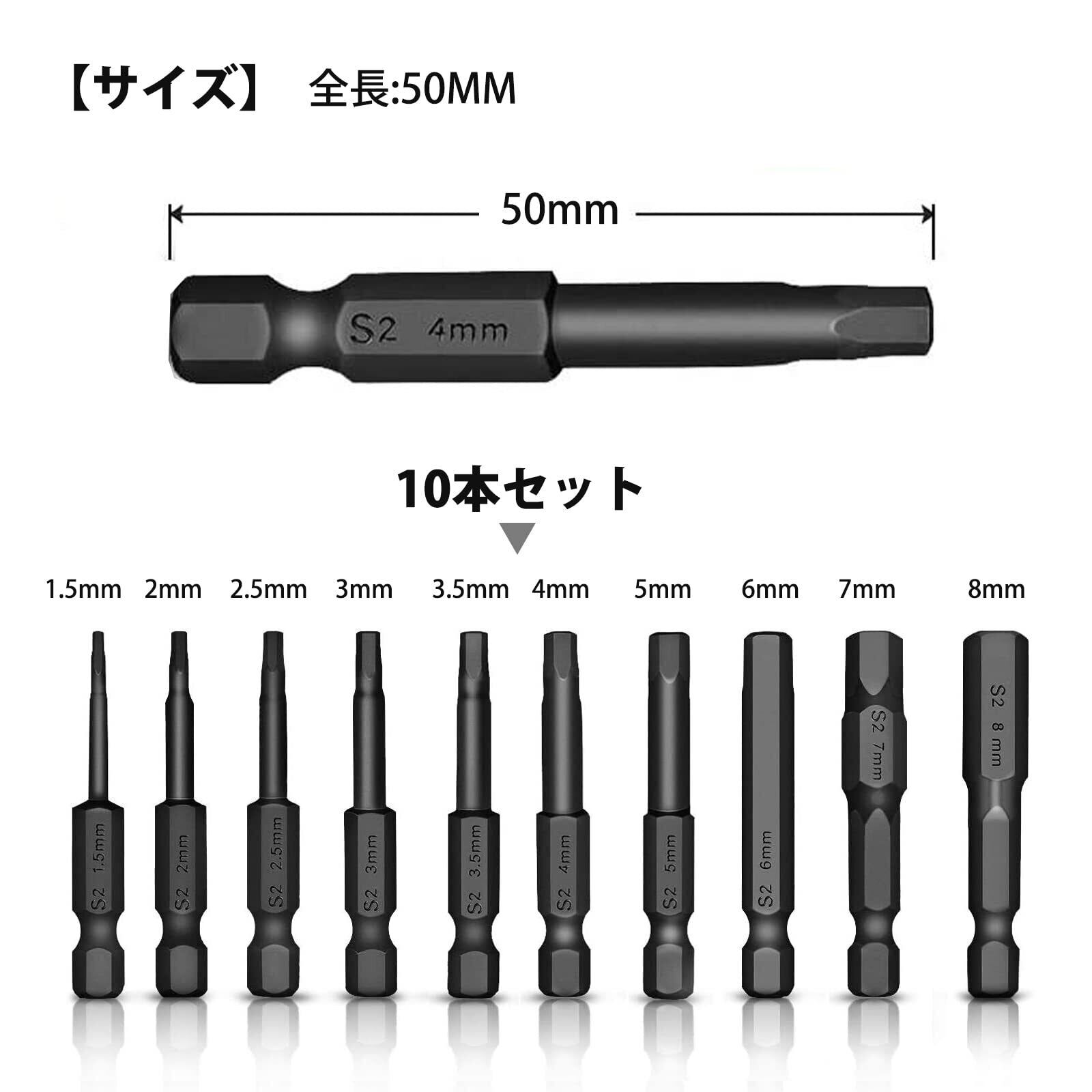 【商品仕様】セット内容:50mm片頭六角ビット10個セット。 全長さ:50mm 。 軸径:6.35mmシャンク(1/4インチ)。 素材:S2合金鋼。 カラー:黒。