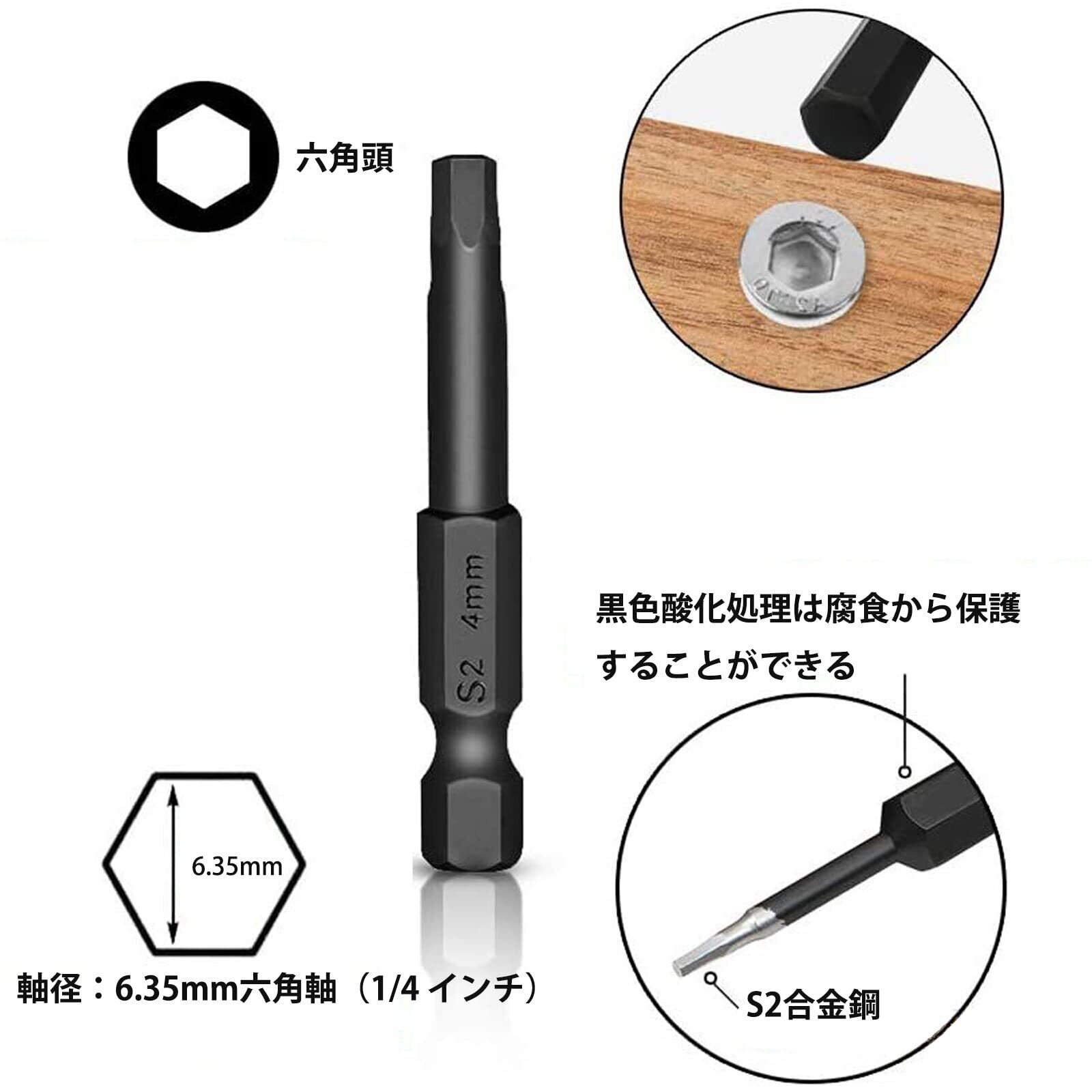 この六角ビットは家具、家電、木工、おもちゃ、コンピュータ、機械、自転車、車両整備、電設工事関連、工場内作業などに適しています。