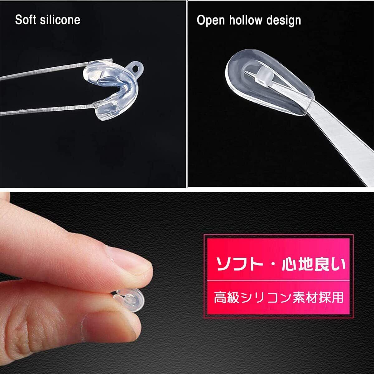 【エアクッションメガネ鼻パット】軽量、透明、シリコン製て衝撃が吸収し、鼻への負担を大幅に減すことができる鼻パッドです。中身はエアクッションで中空構造になっているので、鼻が圧迫される時、パッド内の排気穴からエア(空気)が抜けて、鼻骨に跡がつきにくくなっております。