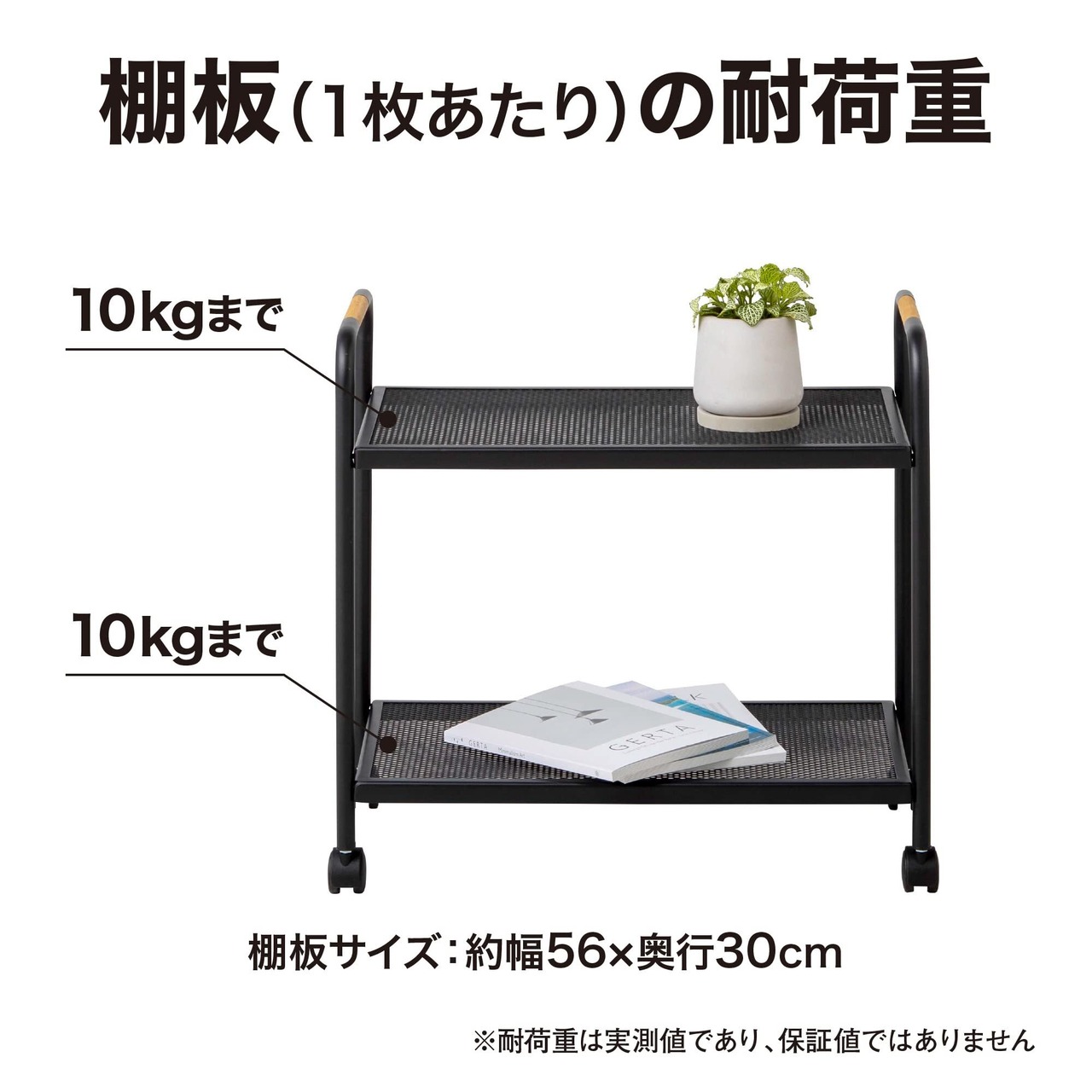 棚板:約幅56cm×奥行30cm(各棚共通)棚板1枚あたりの耐荷重:10kgまで。キャスター:ストッパー機能付き。