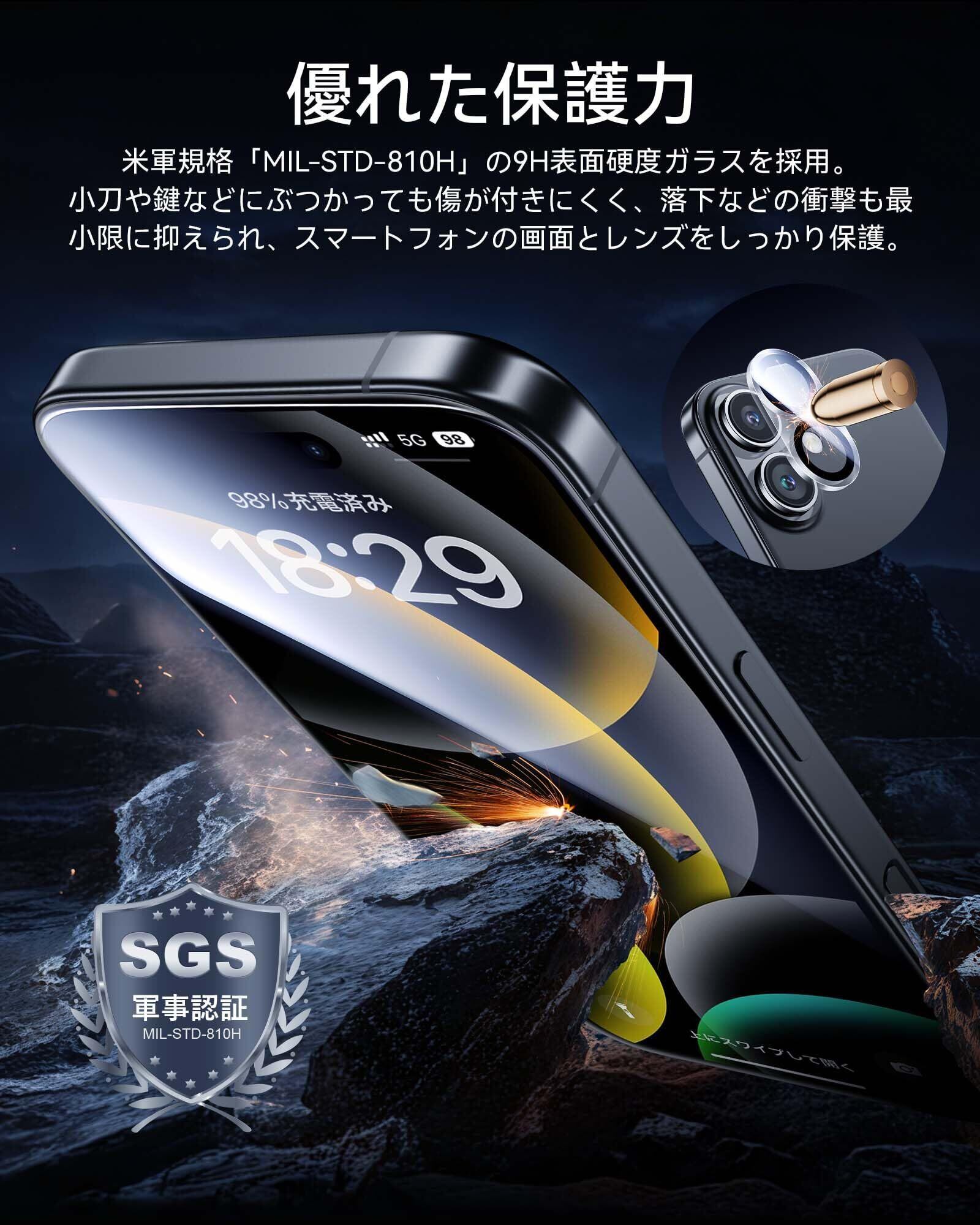 「9H硬度・飛散防止」:米軍規格「MIL-STD-810H」に準拠(認証番号:SZXEC23002005001)。9H硬度のガラス採用。小刀や鍵などの鋭いものにぶつかっても傷が付きにくく、アイフォン 16プラスをしっかり保護します。飛散防止加工により、万一割れてもガラス破片が飛び散ることなく安心です。