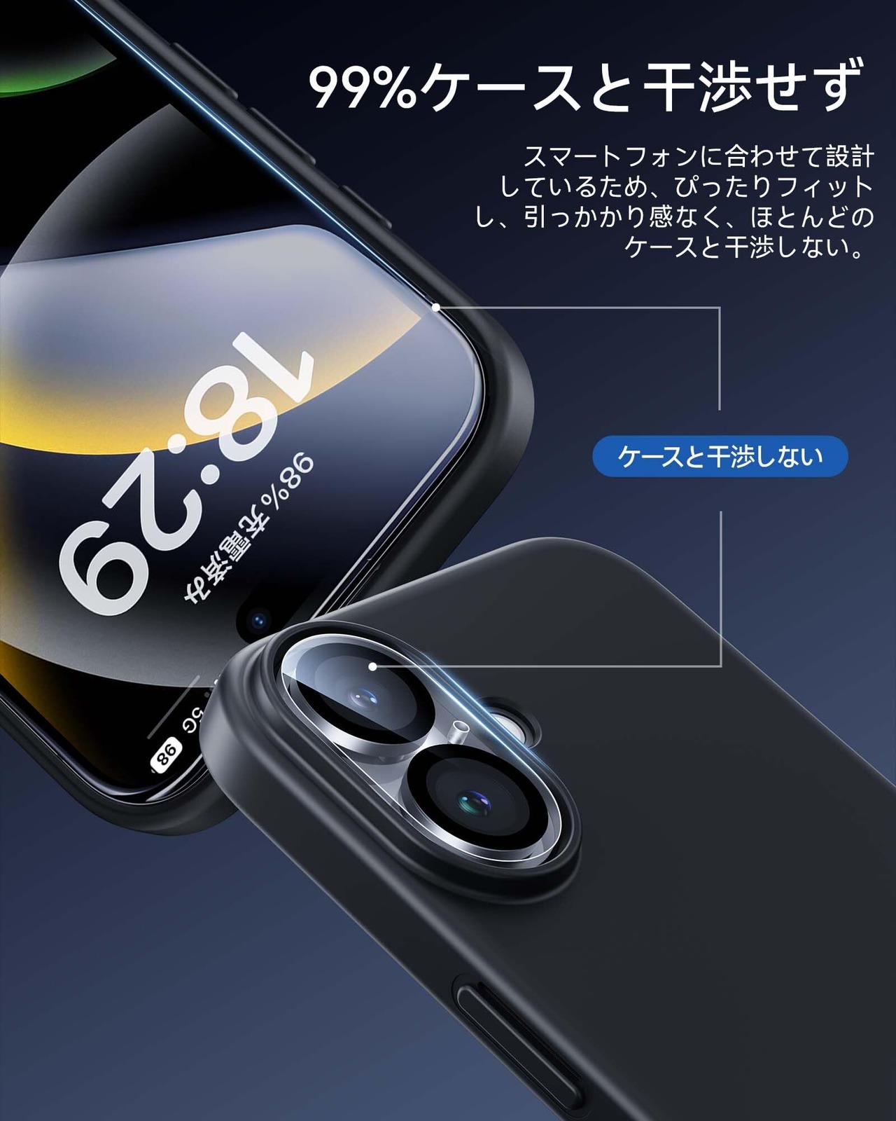 「ケースと干渉しない」:フィルムの剥がれや浮き上がりを防止するため、適度なスペースを残すデザインとなっております。ガラスフィルムは2.5Dラウンドエッジ加工して、エッジが滑らかでほとんどのケースと干渉しない設計となっておりますが、NIMASOのスマホケースと併用するのがおすすめです。