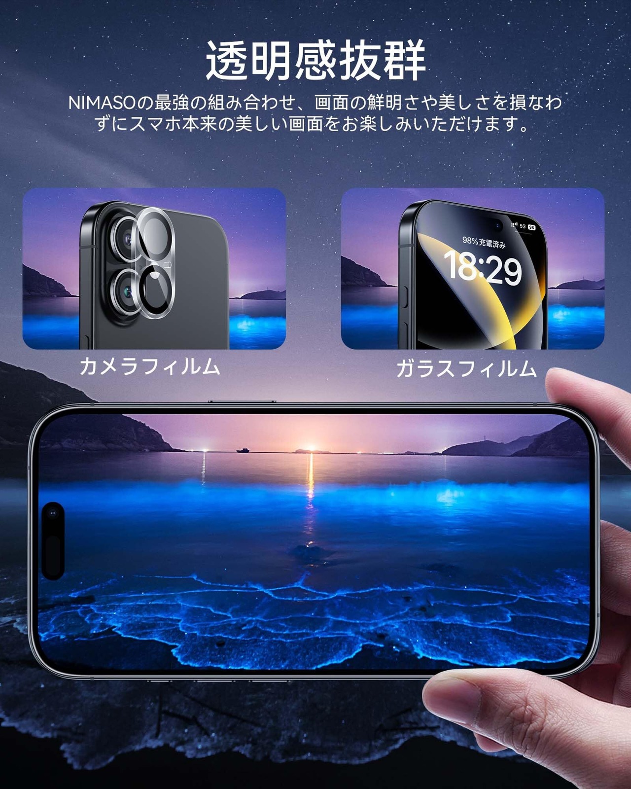 「組み合わせセット」:フィルム製品で大人気のNIMASOから、液晶保護フィルムとレンズ保護フィルムの組み合わせが登場しました!スクリーンとレンズを両方保護。この組み合わせセットで大事ないPhone 16 Plusを徹底的に守ります。