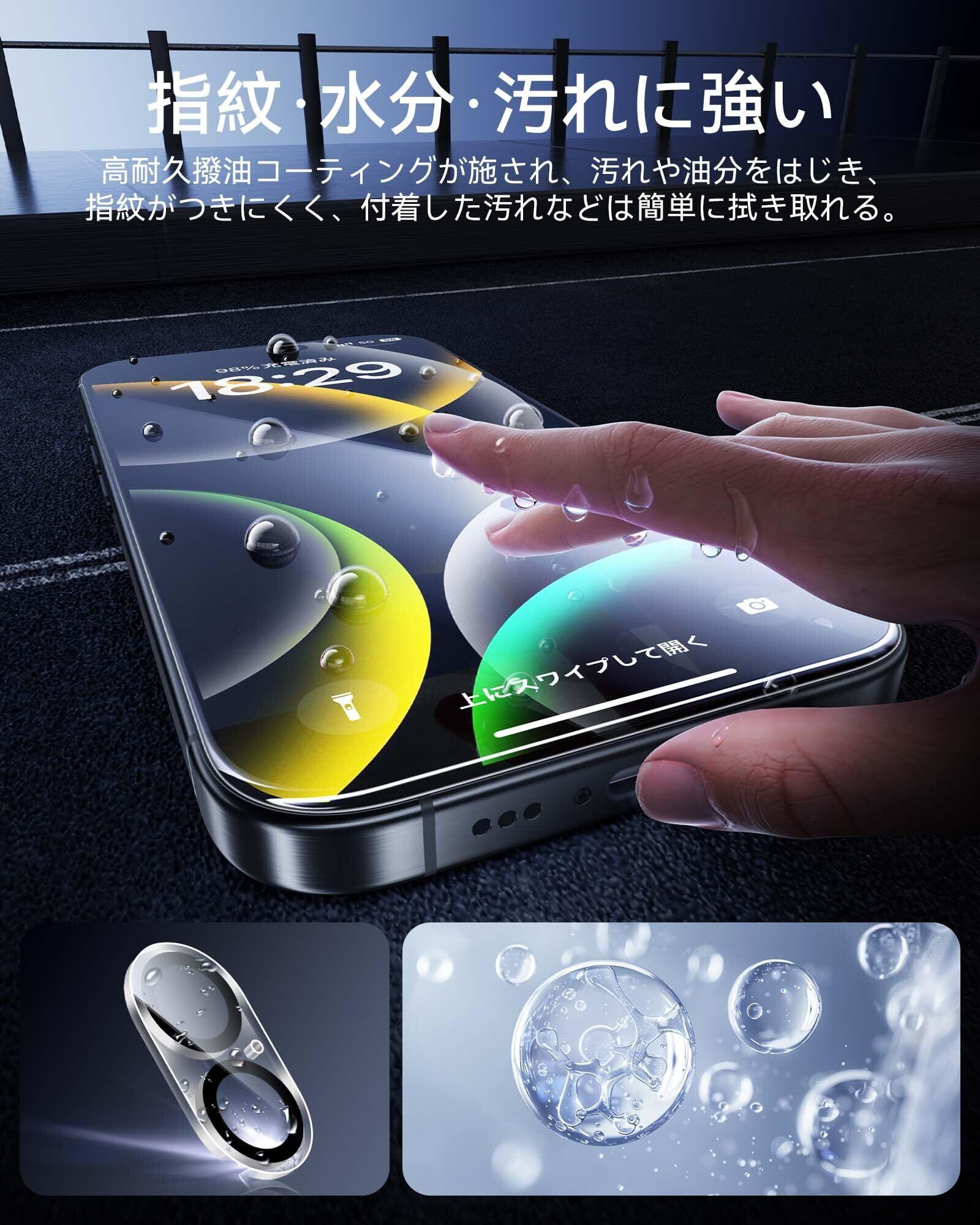 「薄型ガラス・指紋防止」:厚みは約0.33mm。薄いフィルムのため、装着後も違和感なく、タッチ感度も優れています。本製品は撥水撥油のAF(Anti-Fingerprint)コーディング加工とスムーズタッチ加工により、指紋や汚れがつきにくく、油分や水分が強く付着した汚れや指紋がついても、拭き取るだけで綺麗になれます。