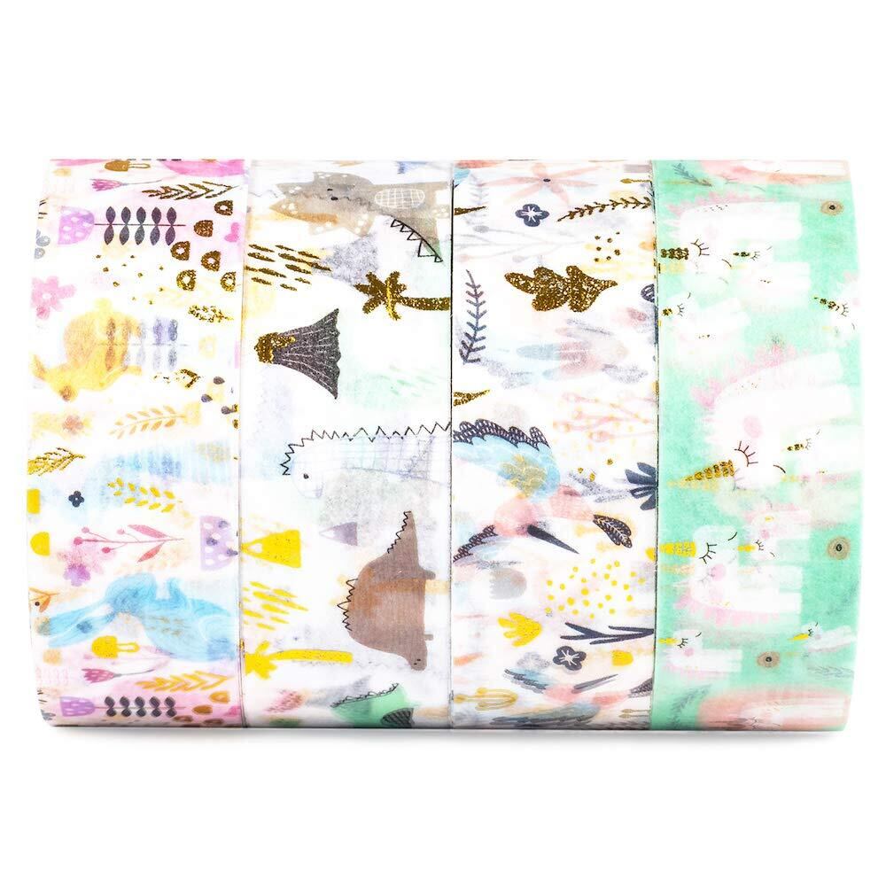 Yubbaex マスキングテープ 金箔押し 可愛いデザイン 15mm幅 x 4巻 プレゼント包装、DIY工芸品、ノートの装飾に使える (動物)