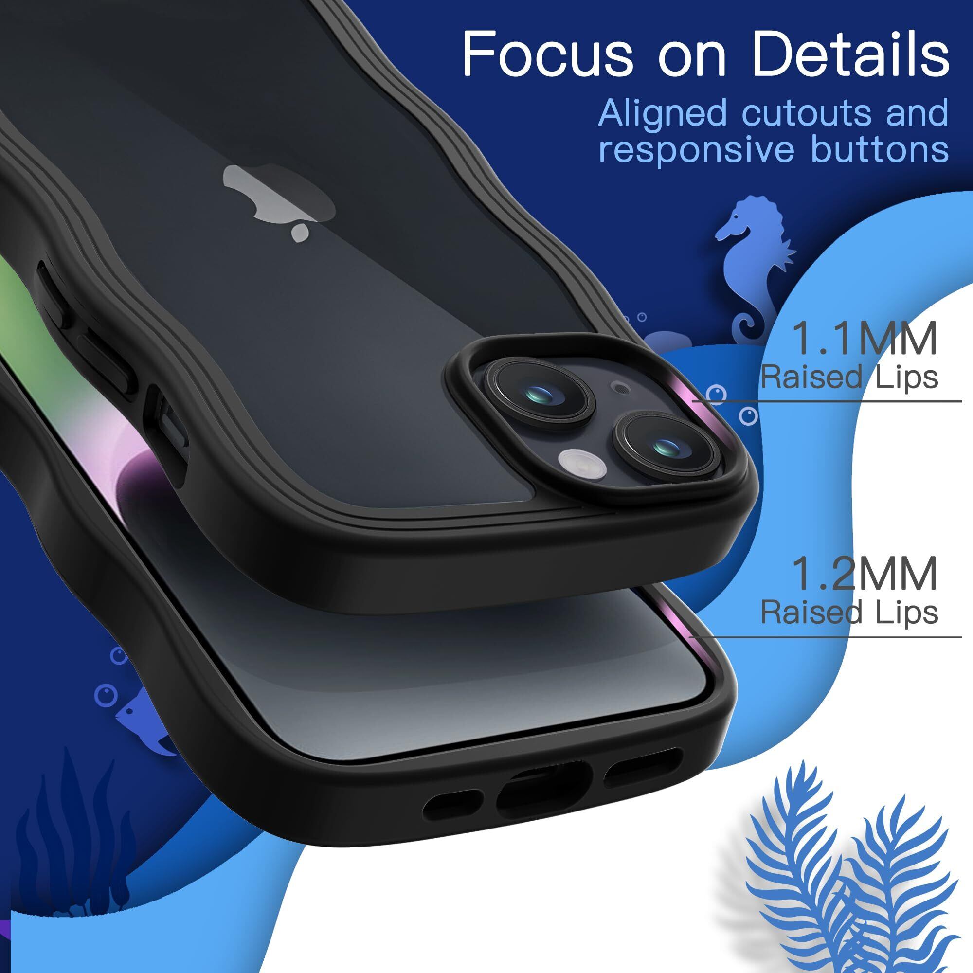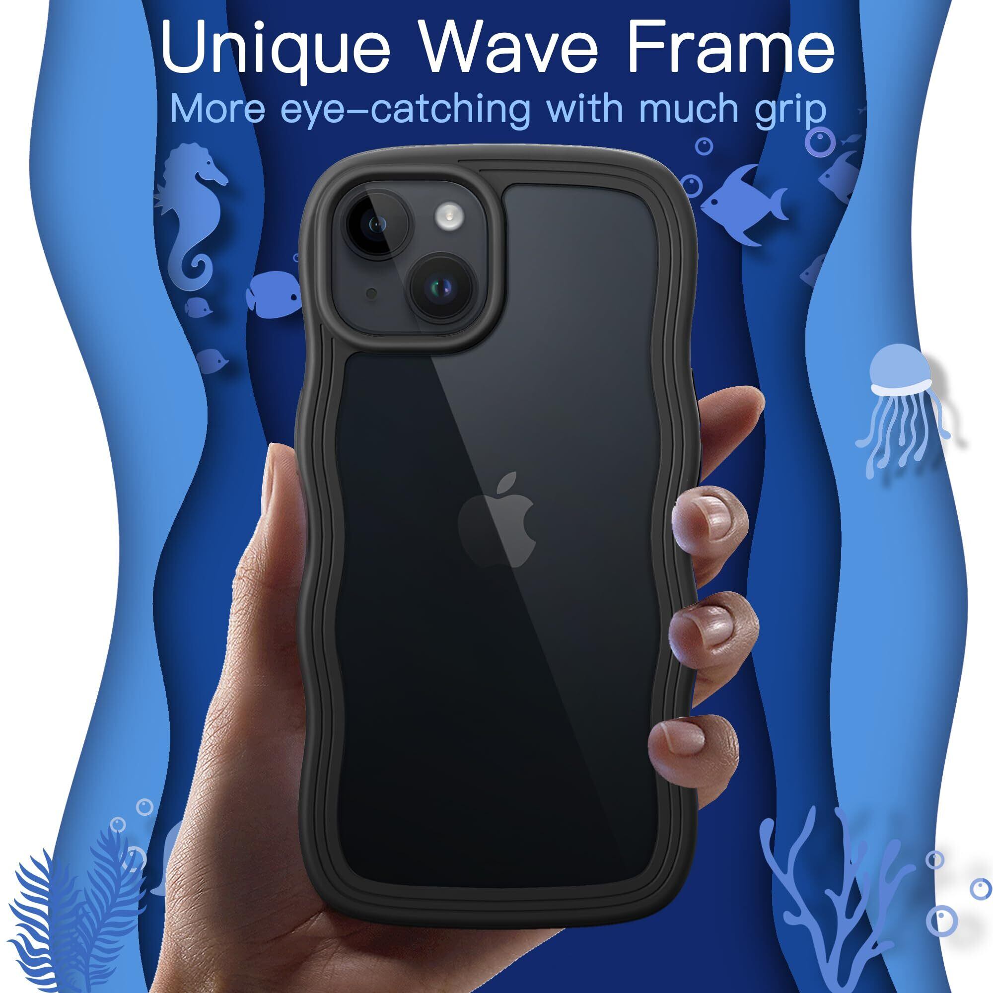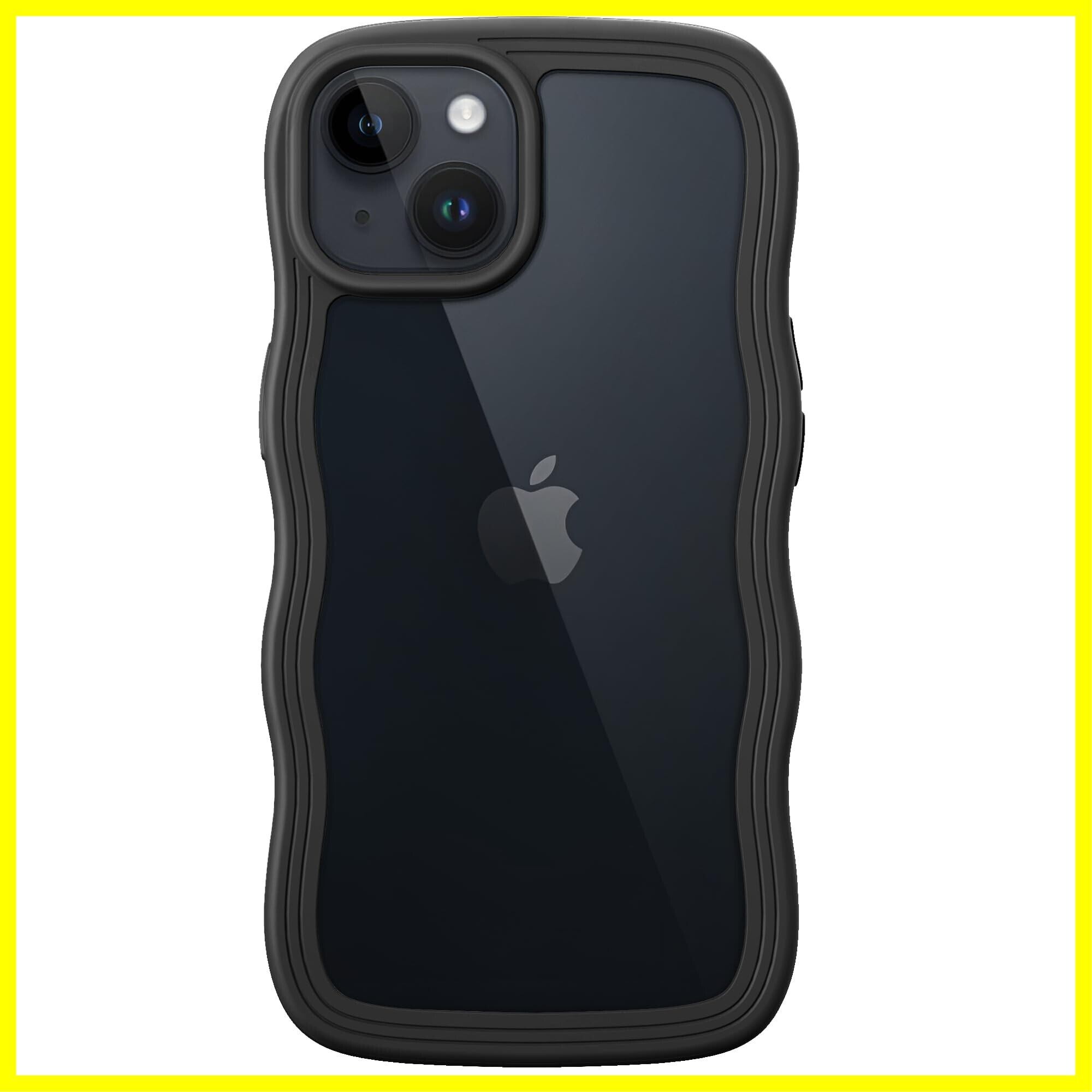 JETech iPhone 14 6.1インチ用 かわいい ケース 波状フレーム うねうね 耐衝撃 スマホカバー 女性用 女子向け クリア ハードPCバック (ブラック)